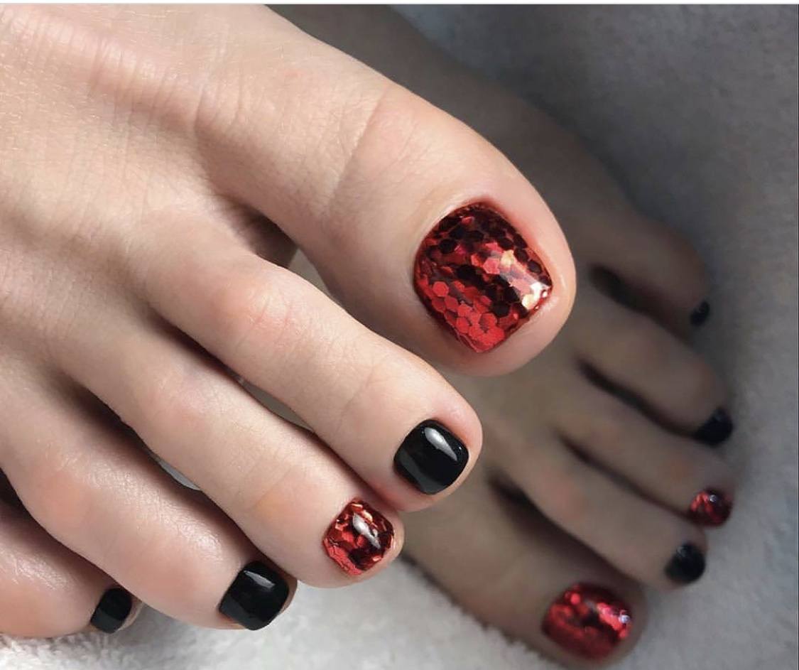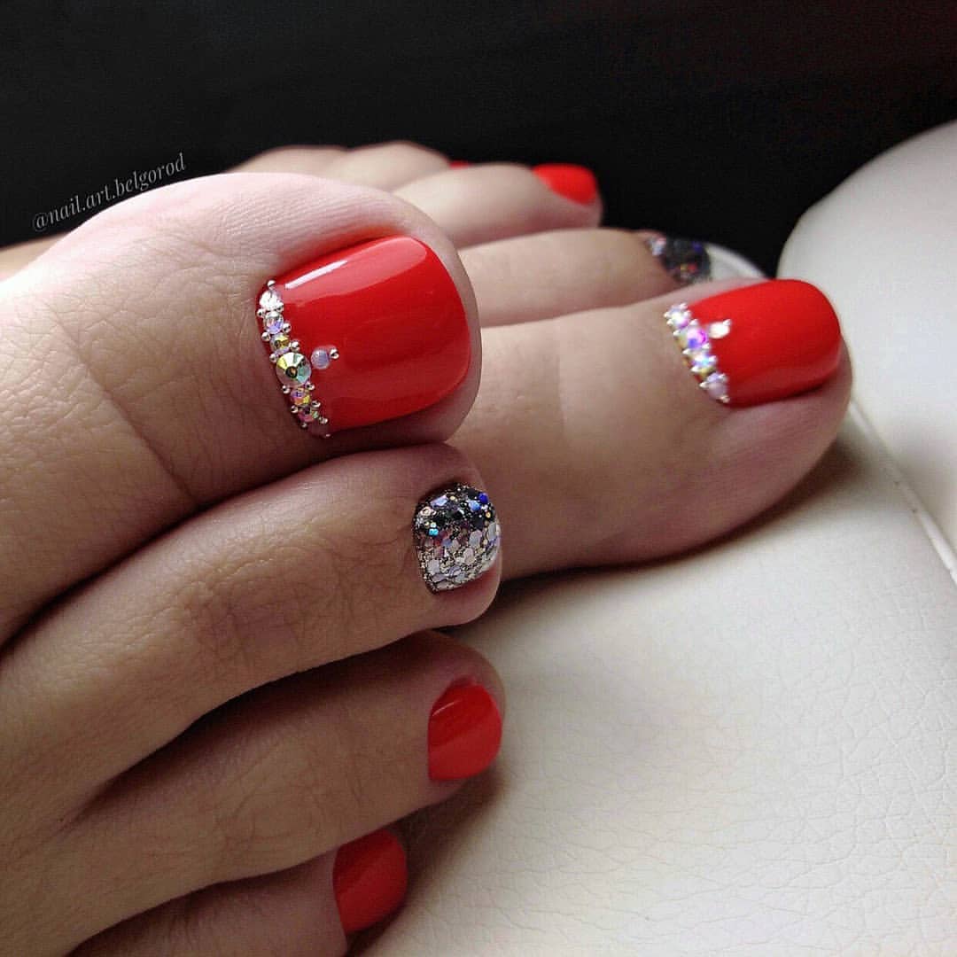 Самым простой и легкий способ разнообразить красный педикюр – это добавить в него блестящий декор. С появлением гель-лаков с глиттером сделать красивый дизайн с блестками стало намного проще. Если правильно расположить сухие блестки было проблематично, то с помощью кисточки с глиттером можно выполнить абсолютно любой узор. Есть несколько вариантов декорирования ногтей блестками: