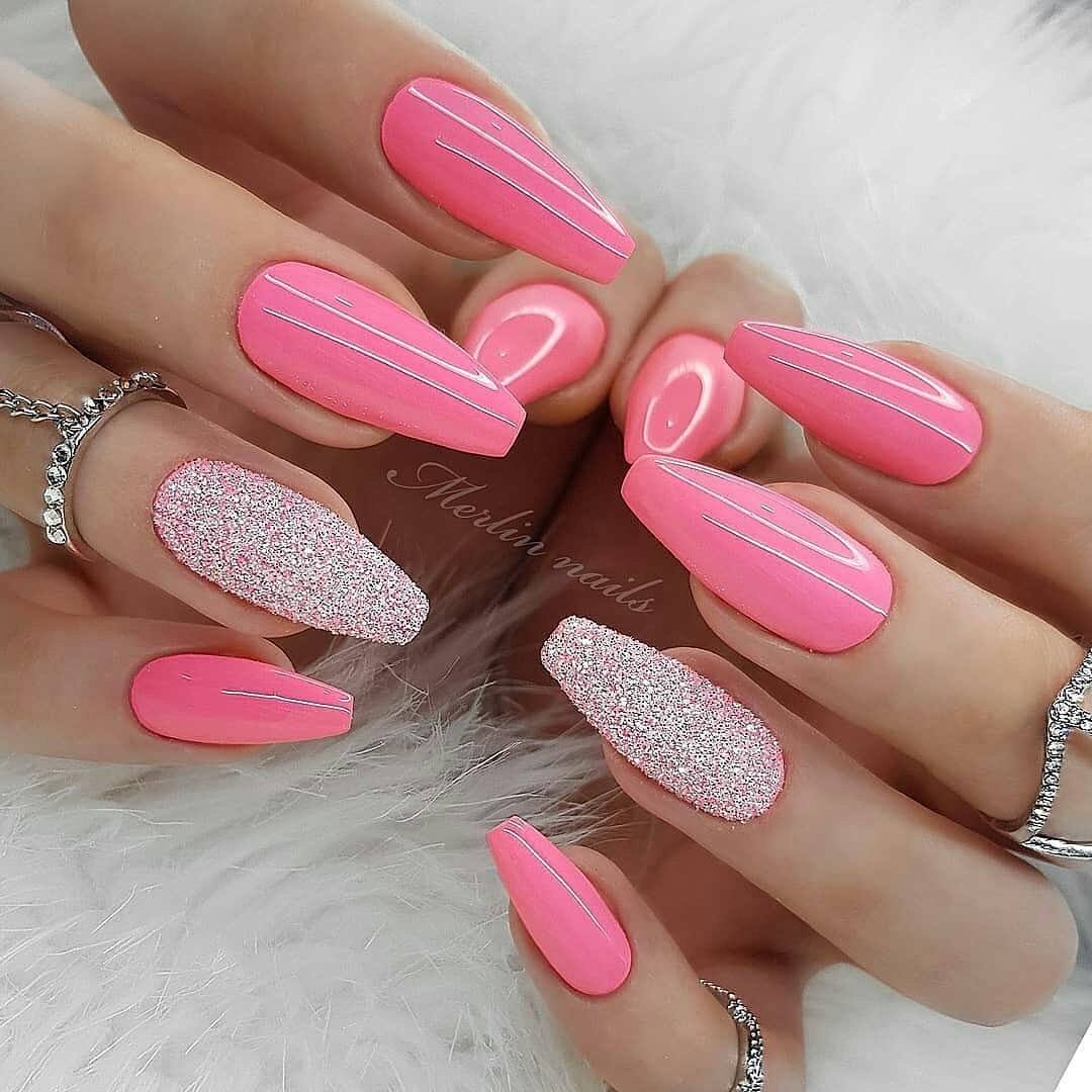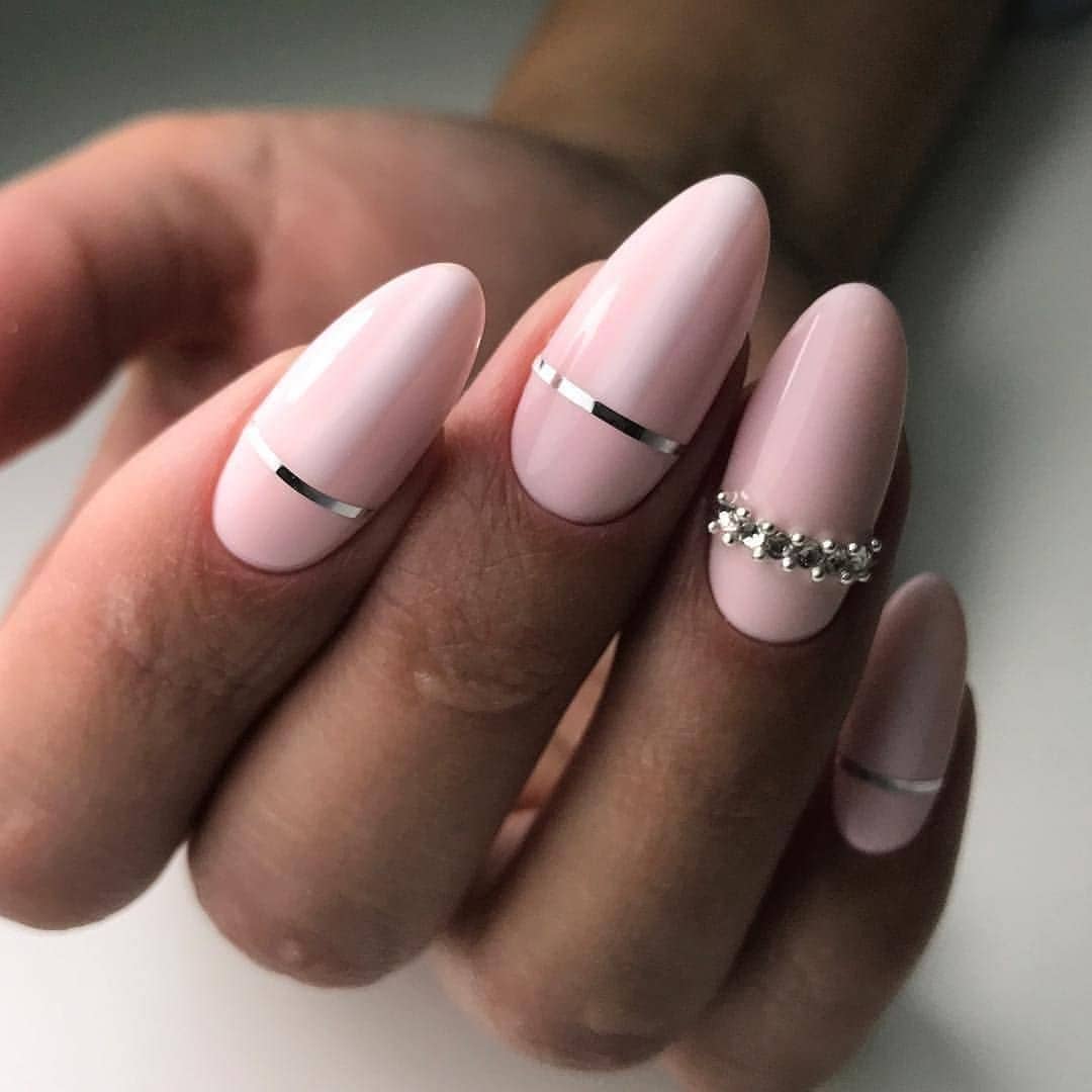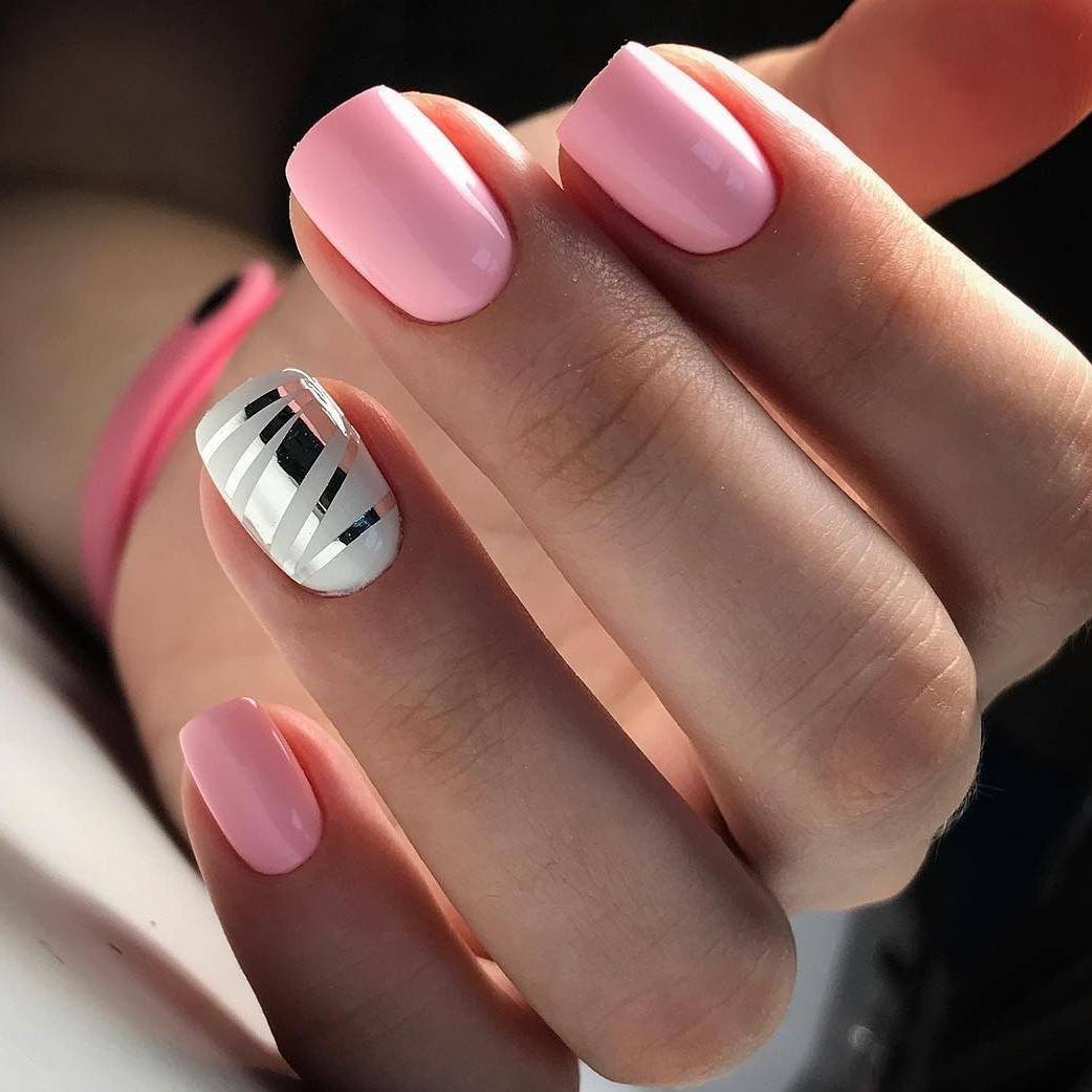 Аккуратные линии серебром или выделение лунок подчеркивают розовый цвет. Серебряное оформление не перегружает дизайн. Подойдет на любой выбранный образ и подчеркнет нежный макияж.