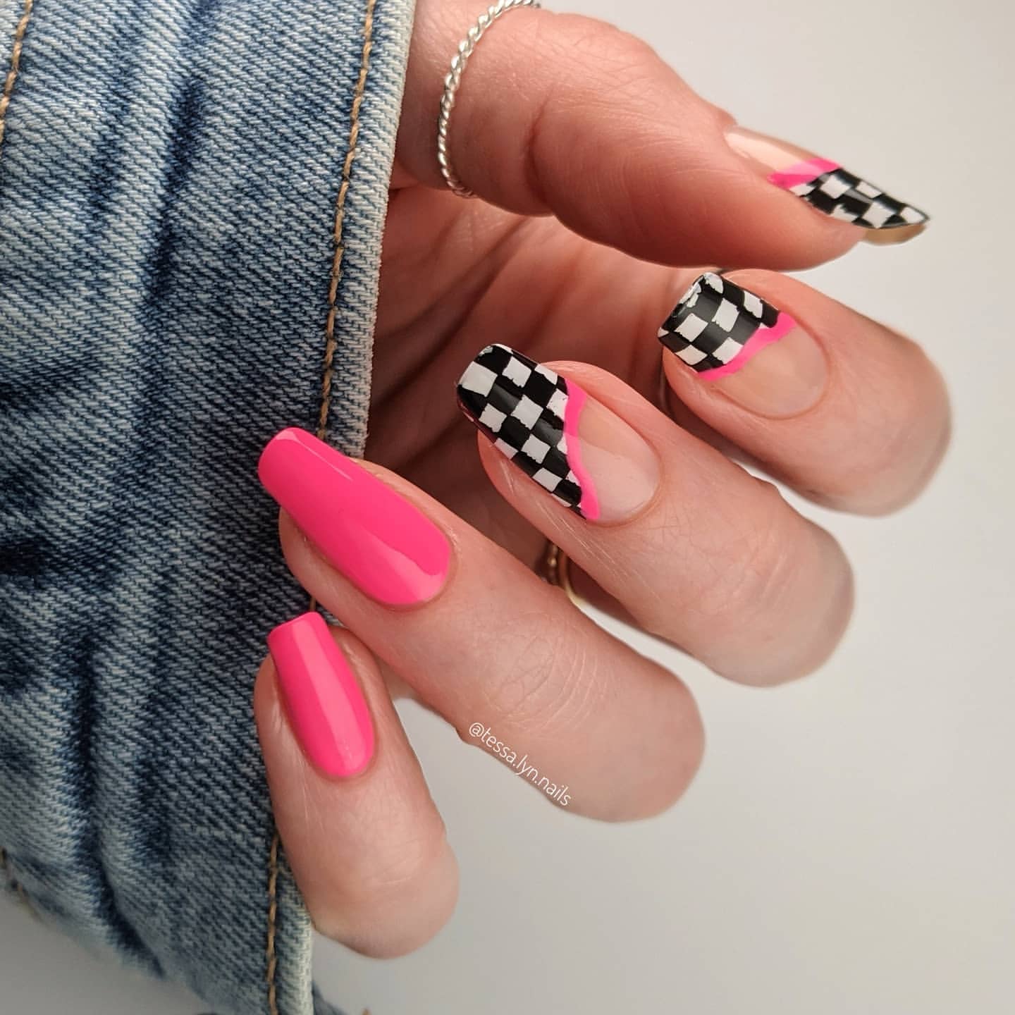 Как мы упоминали выше, розовый прекрасно сочетается с базовыми цветами, одним из которых является черный. В маникюре эта парочка выглядит очень элегантно и стильно, образуя эффект инь-янь: розовый разбавляет глубокий черный, а вместе они балансируют насыщенность и яркость друг друга.