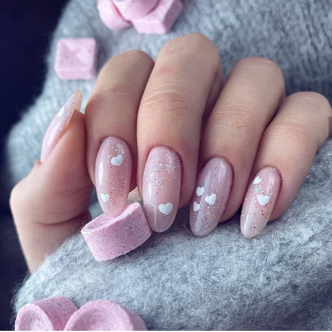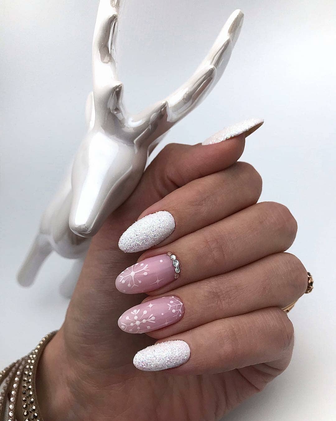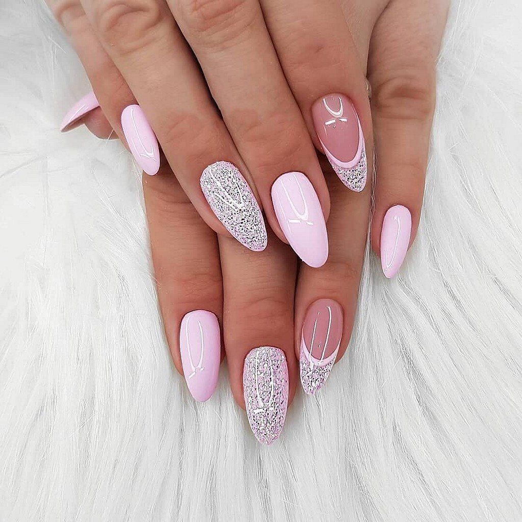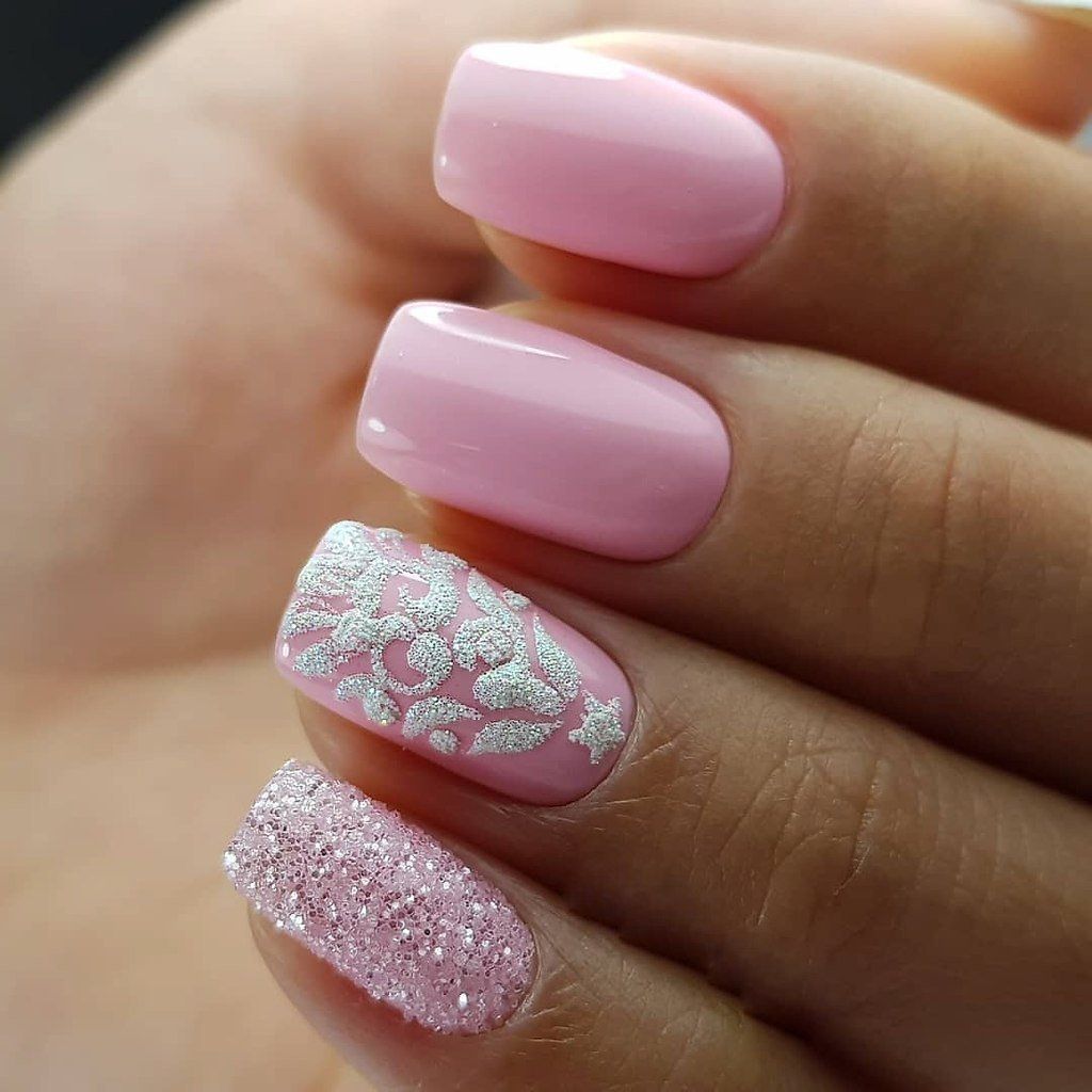 С серебряным глиттером работает то же правило, что и с золотым: его можно и нужно использовать на нежном фоне. Присмотрись к сияющим элементам: в сезоне 2023 розовый маникюр со стразами находится на пике популярности