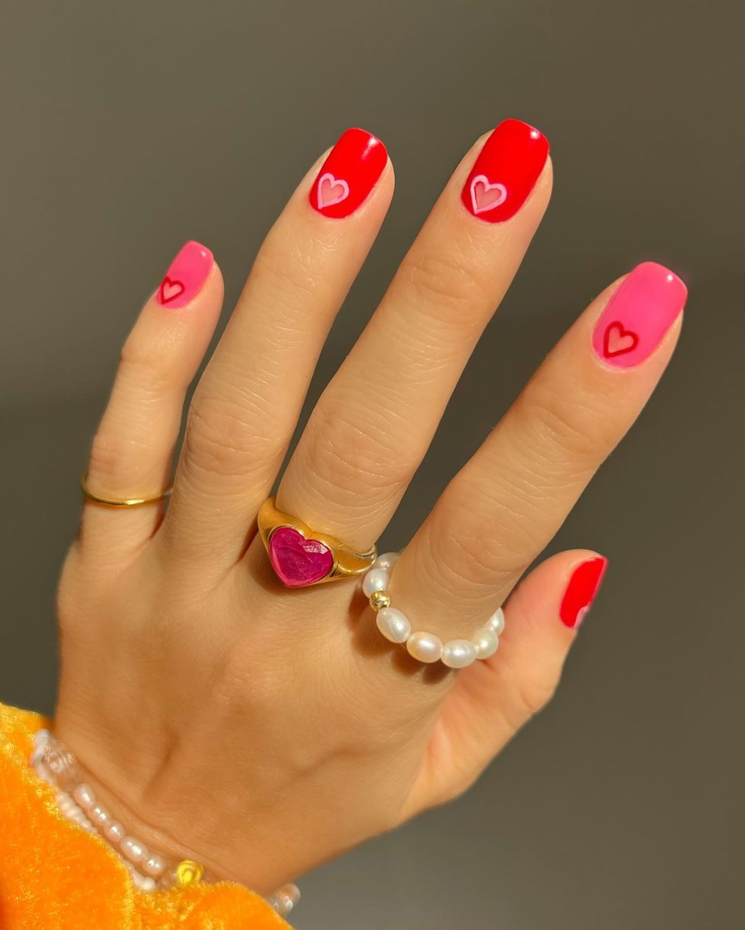 Красно-розовые сочетание смелое и модное. Эксперименты с оформлением получается интересно. Главное не переборщить, и совмещать оттенки разные по тону. Рисунки, стразы, градиенты или выделения ногтя по краям красным лаком.