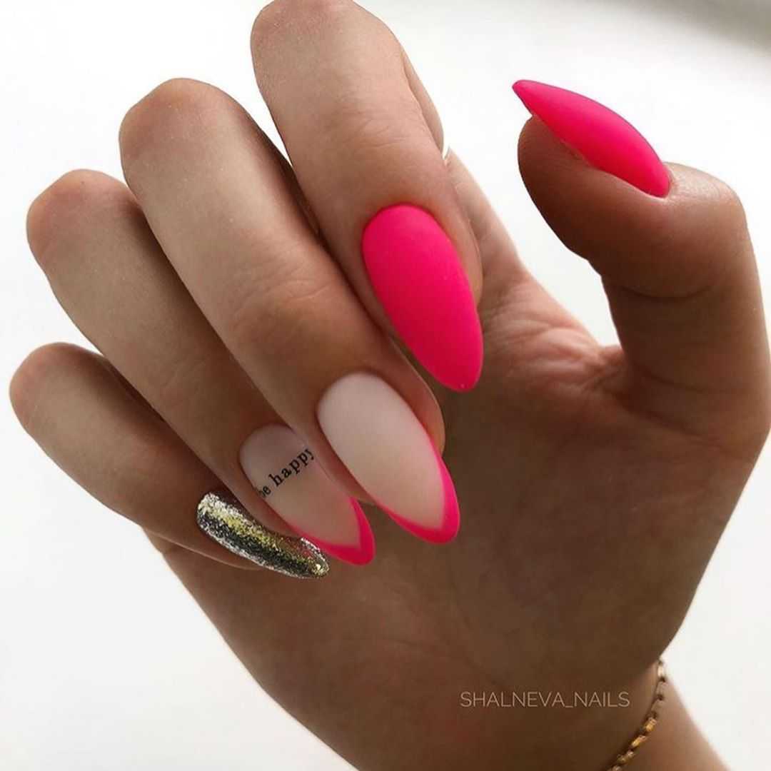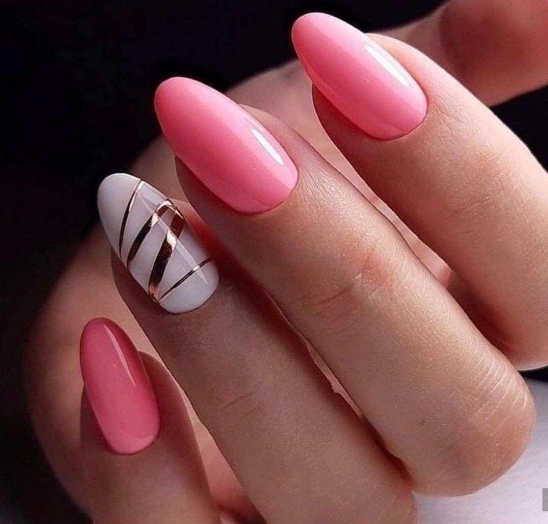 Розовый в дуэте с оранжевым, выбор решительных натур. Дизайн оформляют геометрией, омбре, градиентом или лунным. Для работы подойдет приглушенный нейл-арт, а на праздники возможно выбрать яркий вариант.