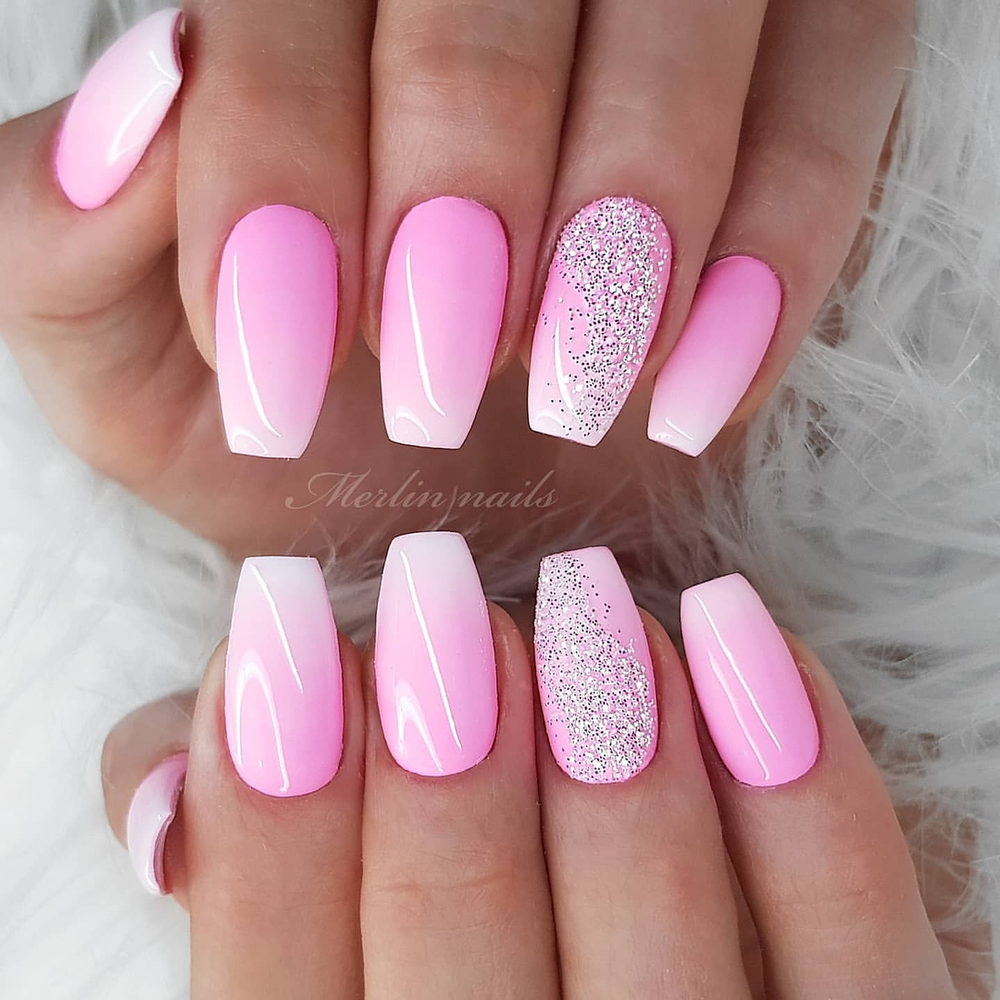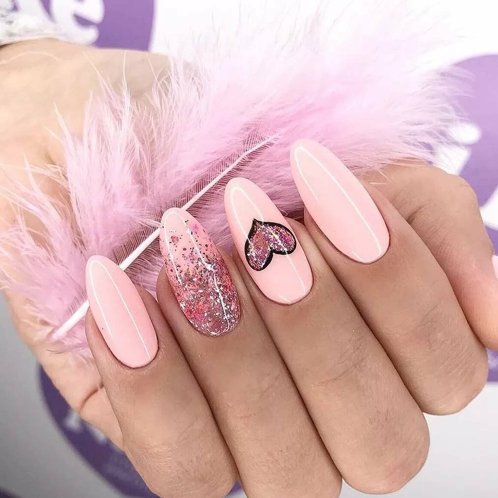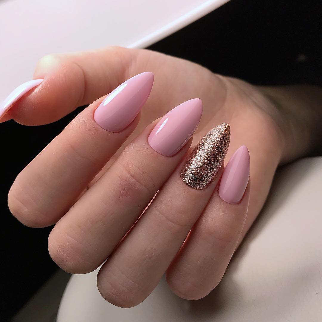 Блестки наносятся тонким или толстым слоем. Поверх розового кладут тонкий слой крупного шиммера, выделяют несколько ноготков толстым слоем мелкого глиттера. Блестящий дизайн подойдет к праздничному наряду и работы.