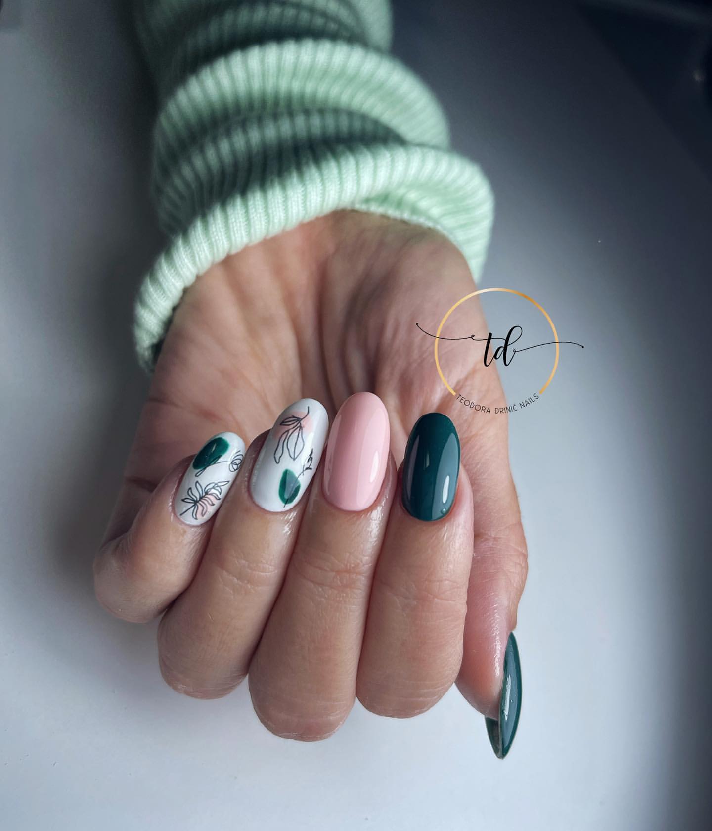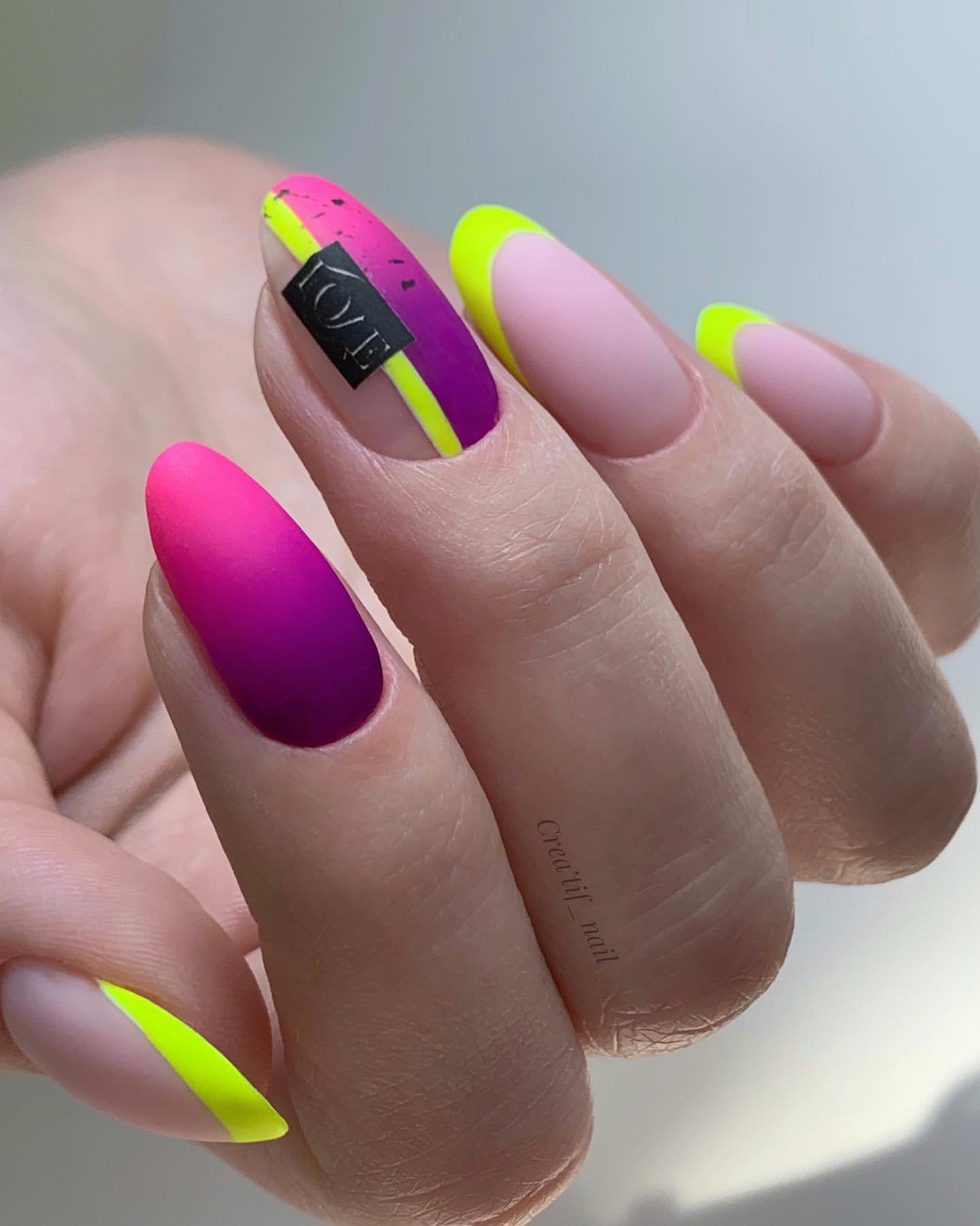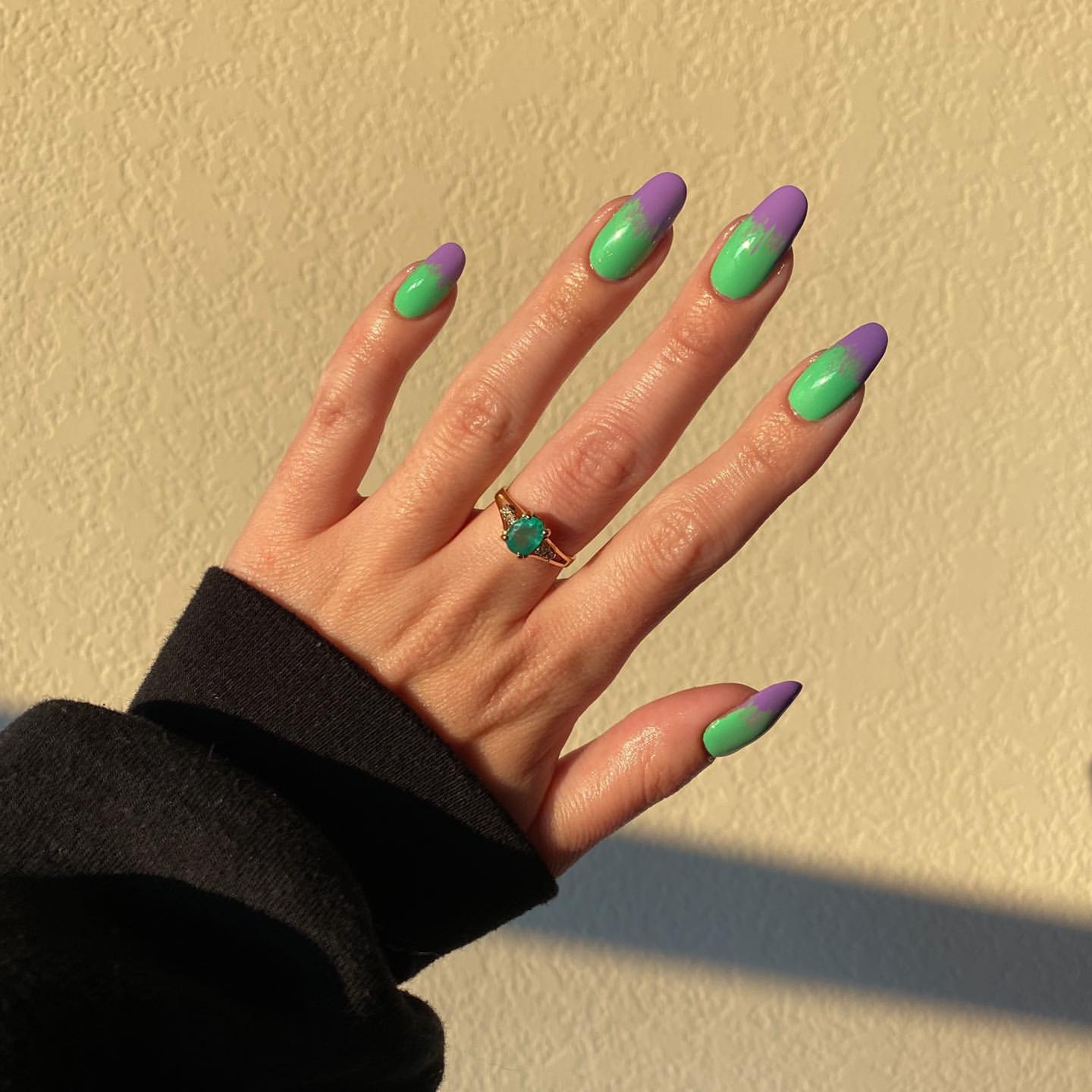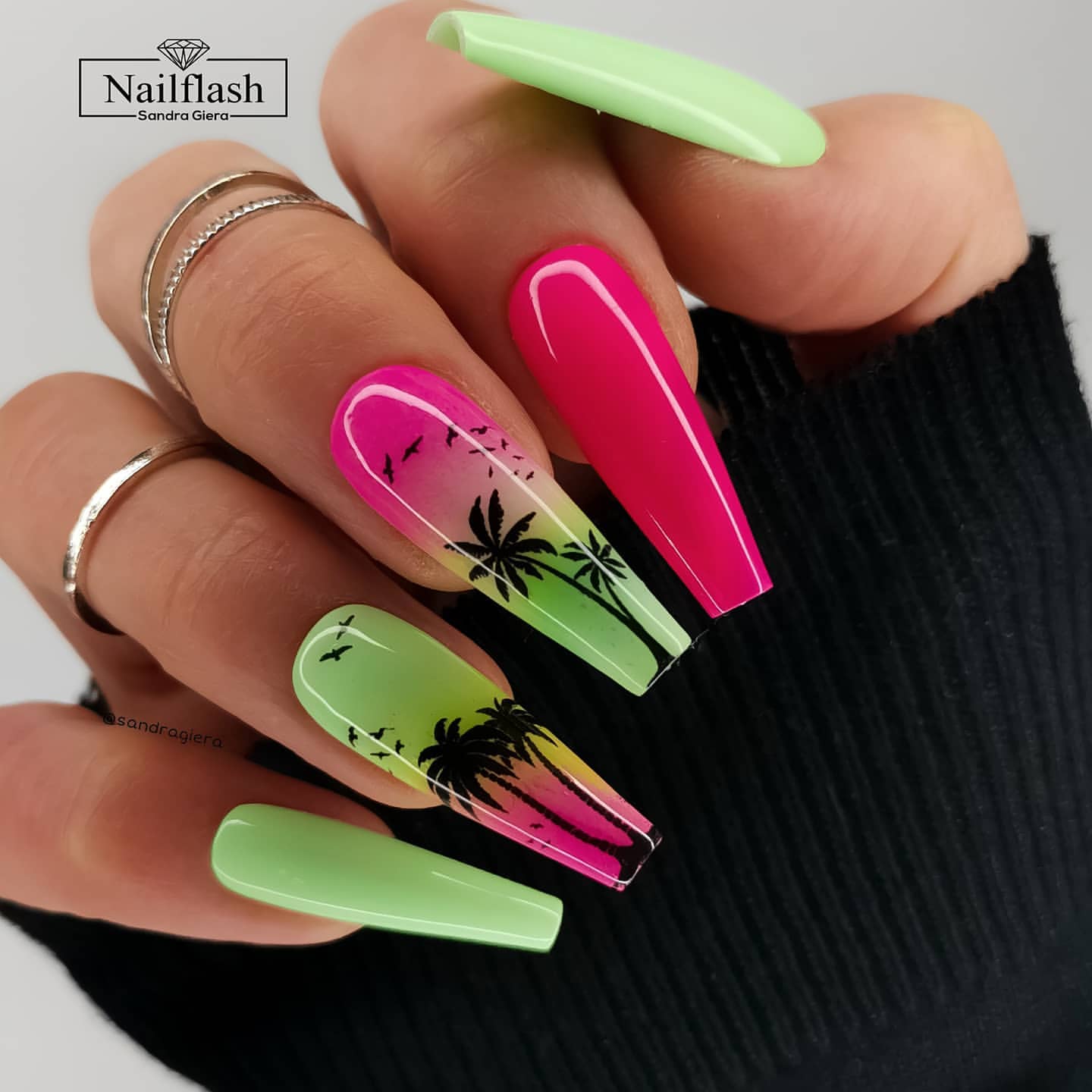 Зеленый подойдет для вечеринки или отпуска. Дизайн делается в неоновых цветах, ярких или пастельных. Для офисного дресс-кода, яркие оттенки будут неуместны. С пастельным выбором цветов, где розовый основной, а зеленый дополнительный, может подойти для работы.