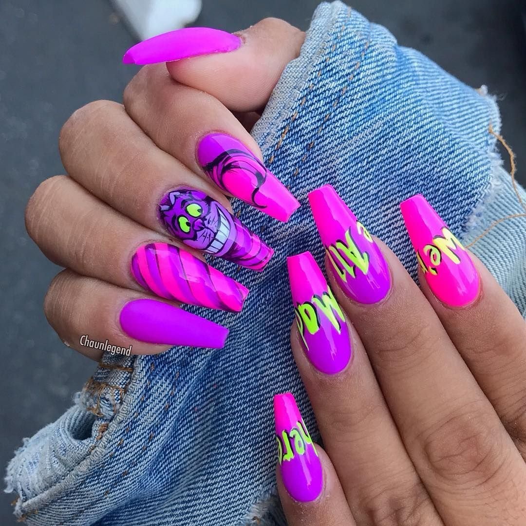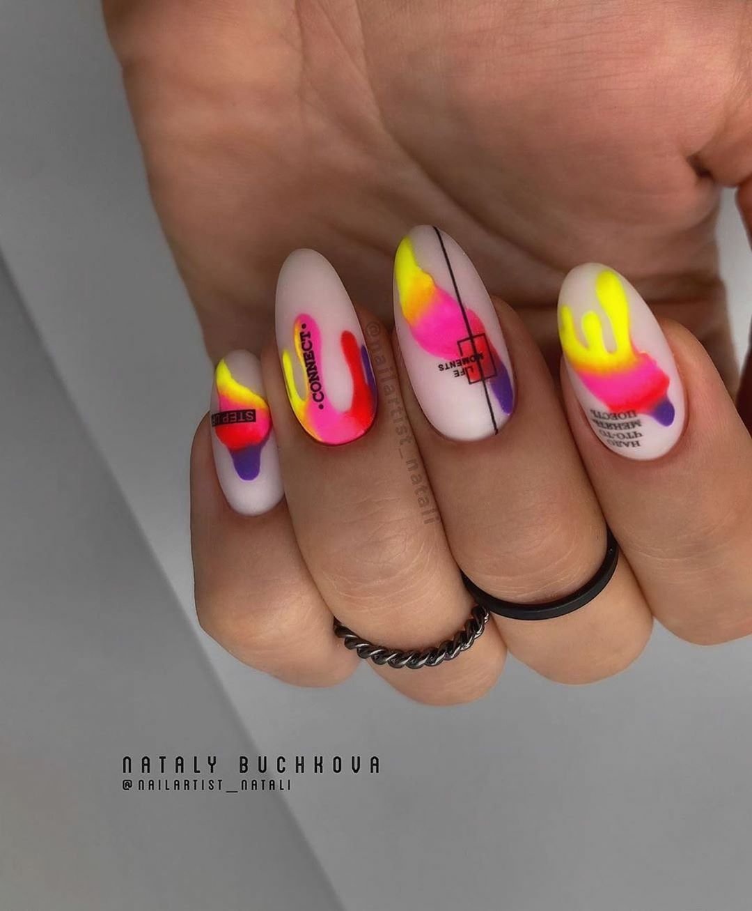 Какой дизайн будет уместно смотреться на неоновом разноцветном маникюре?На неоновом разноцветном фоне можно разместить тематические надписи черного цвета, или же воспользоваться стемпингом, и украсить один из ногтей звериным принтом, покрыв его сверху перламутровой втиркой.