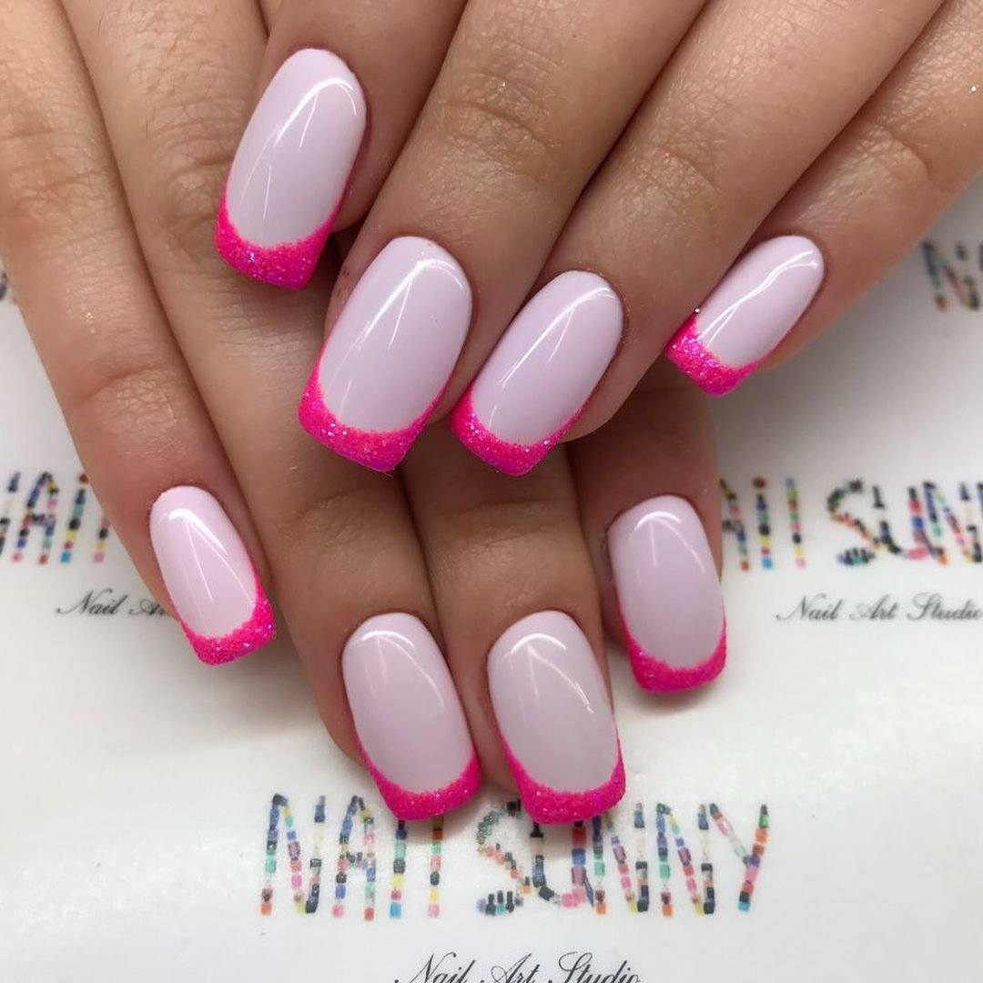 Вариации французского маникюра с розовым цветом в этой техники множество, необязательно в классическом сочетании. Иногда делают обратный френч, на лунки или по краям. Оформление визуально удлиняет пальцы.