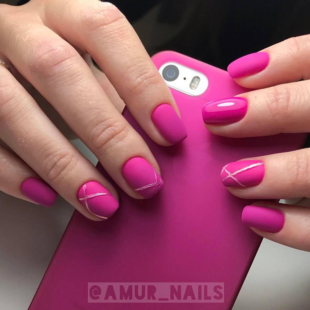 Ногти с матовым топом приобретают лаконичный вид, без намека на глянец. Сочетается с разными техниками. Выбирать лучше розовый цвет из темных и сочных оттенков. Матовый финиш маркий, может сереть на светлых тонах.