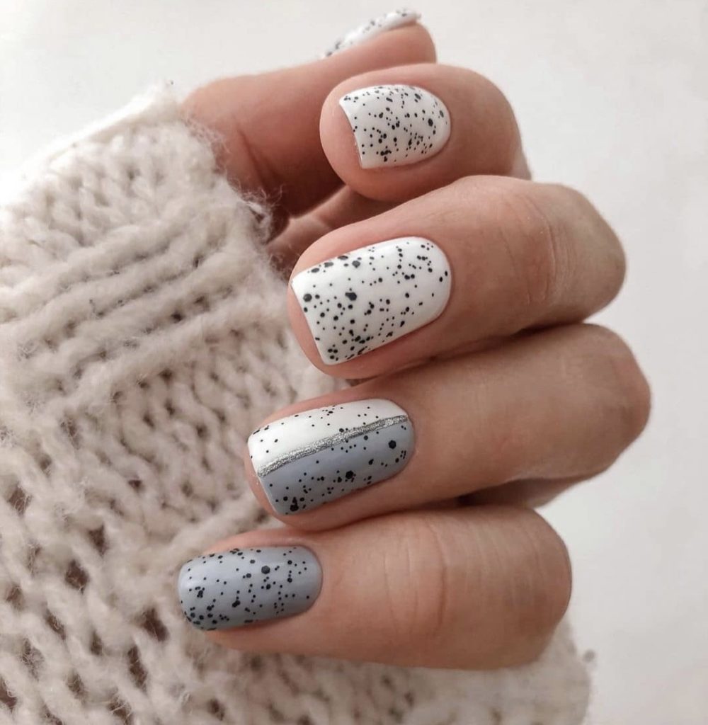 Одно из модных направлений сегодня в ногтевом дизайне. Внешне ноготь с таким дизайном действительно похож на перепелиное яйцо, отсюда и название. Мастер в работе наносит на светлую основу чёрные крапинки. Рекомендуется такой рисунок наносить на все ногтевые пластины. Тогда маникюр выглядит более эффектно.