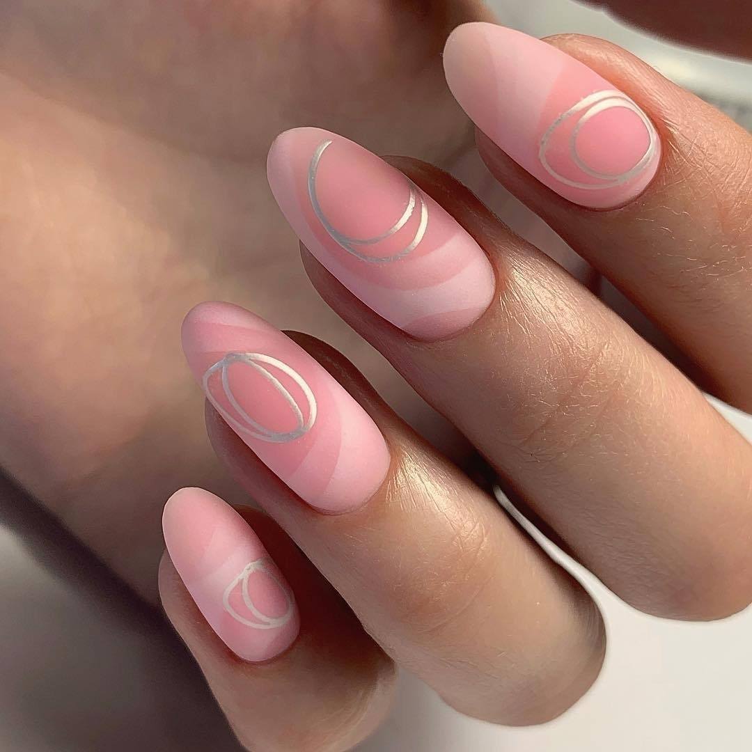 Розово-бежевый дизайн хорошо выглядит с матовым топом. Оформляют вензелями, золотом, серебром, рисунками тонкой кистью. Маникюр подойдет на каждый день и подчеркивает руки.