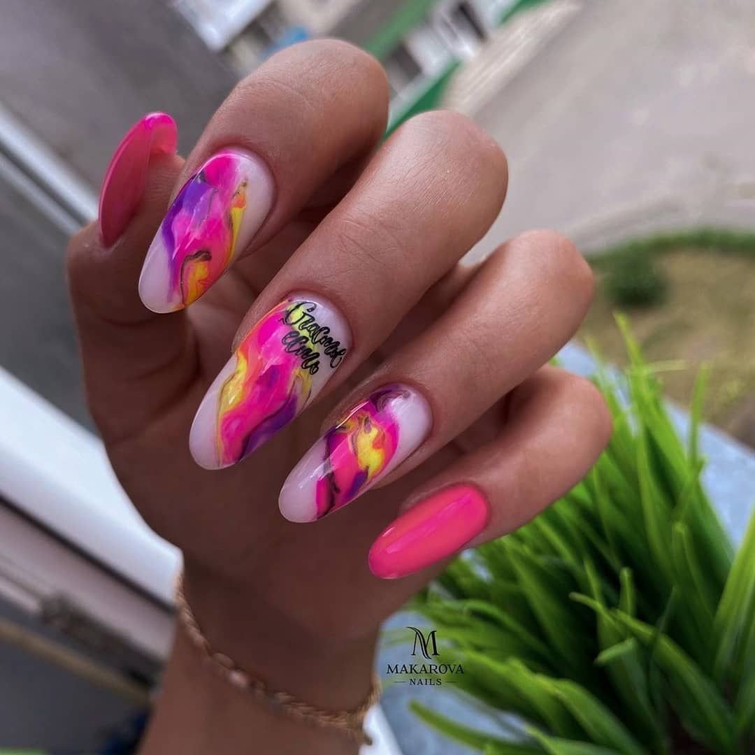 Розово-желтый – это креативное решение, напоминающие летнее солнце. Эти цвета идеально смотрятся в однотонном исполнение. Также подойдут техники: градиент, рисунки, геометрия, омбре.