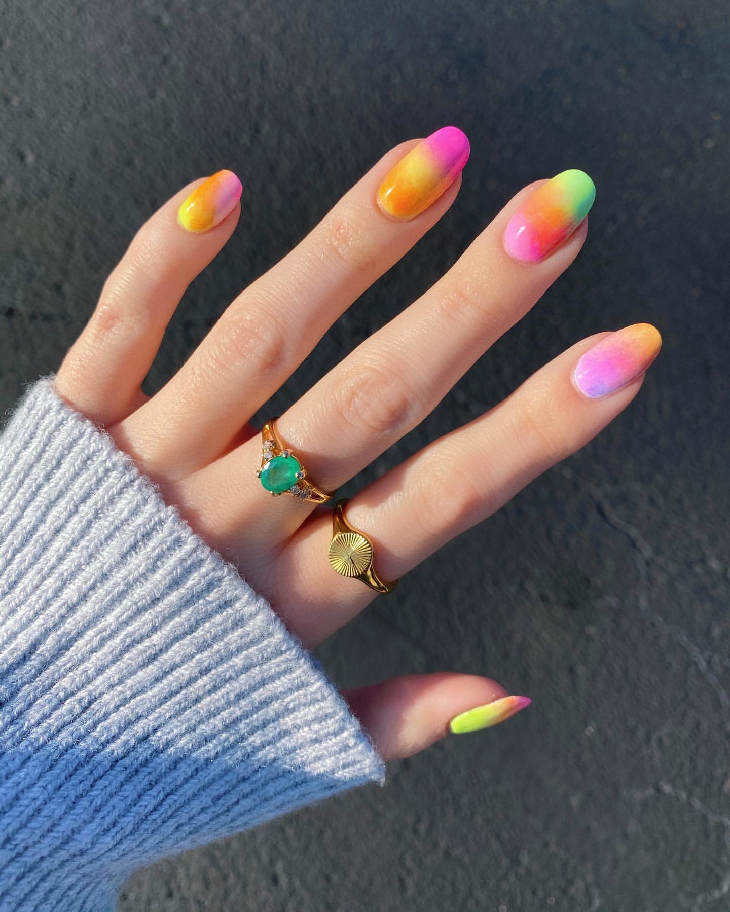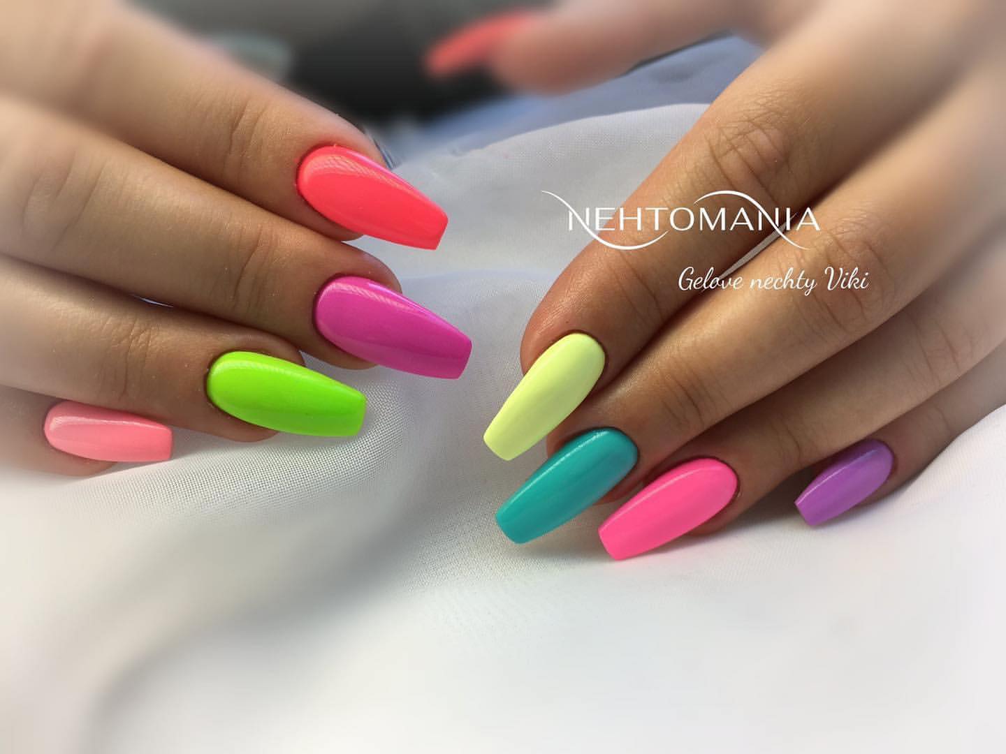 В летнее время года ногти разного цвета на разных руках могут быть украшены неоновыми, пастельными, яркими, а также нюдовыми оттенками. От темной палитры лучше воздержаться, светлые оттенки лака отлично оттеняют благородный загар кожи. Летний маникюр уместно украшать звериным дизайном, цветочными мотивами, водным, лунным, омбре, а также мраморным дизайном.