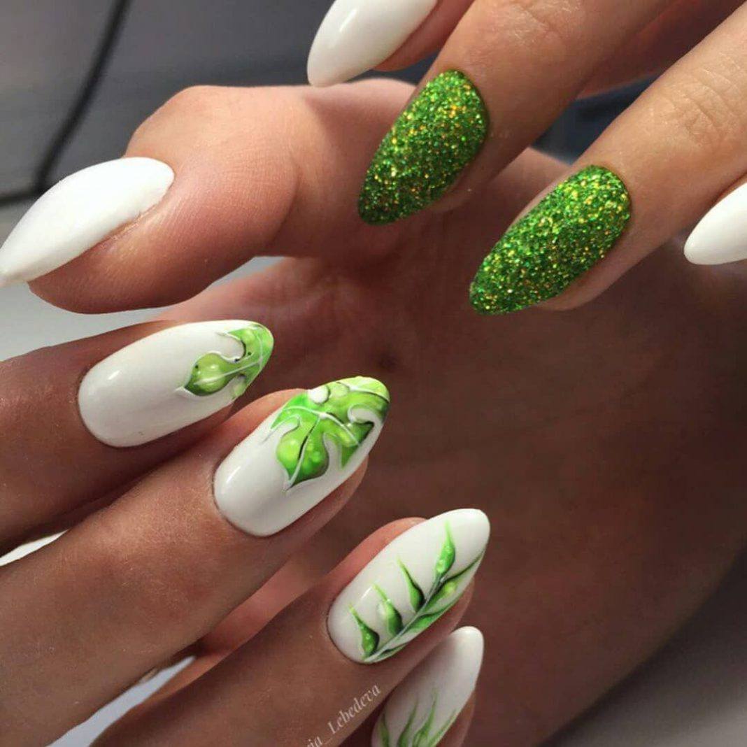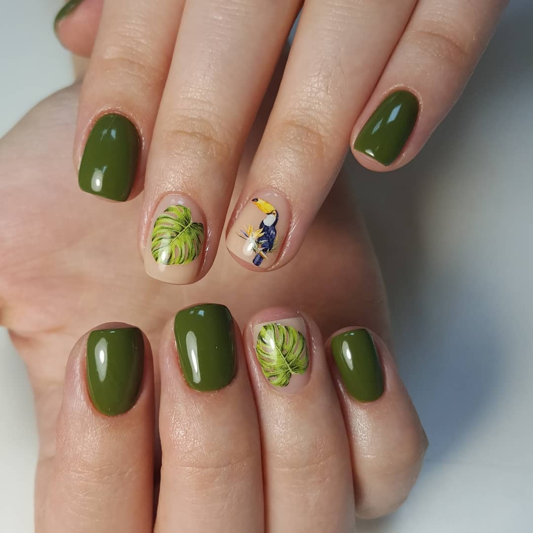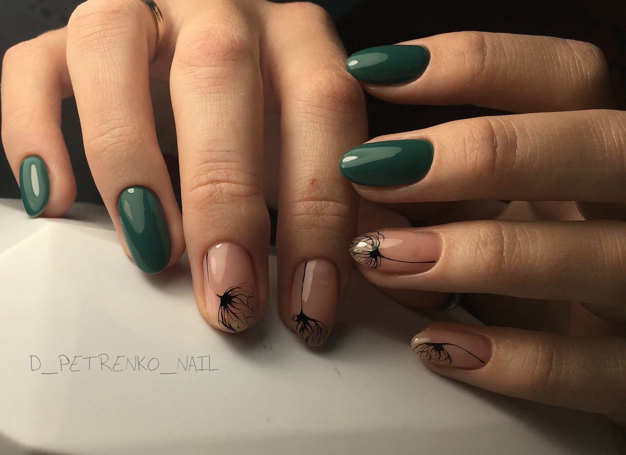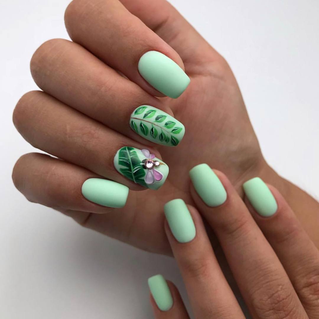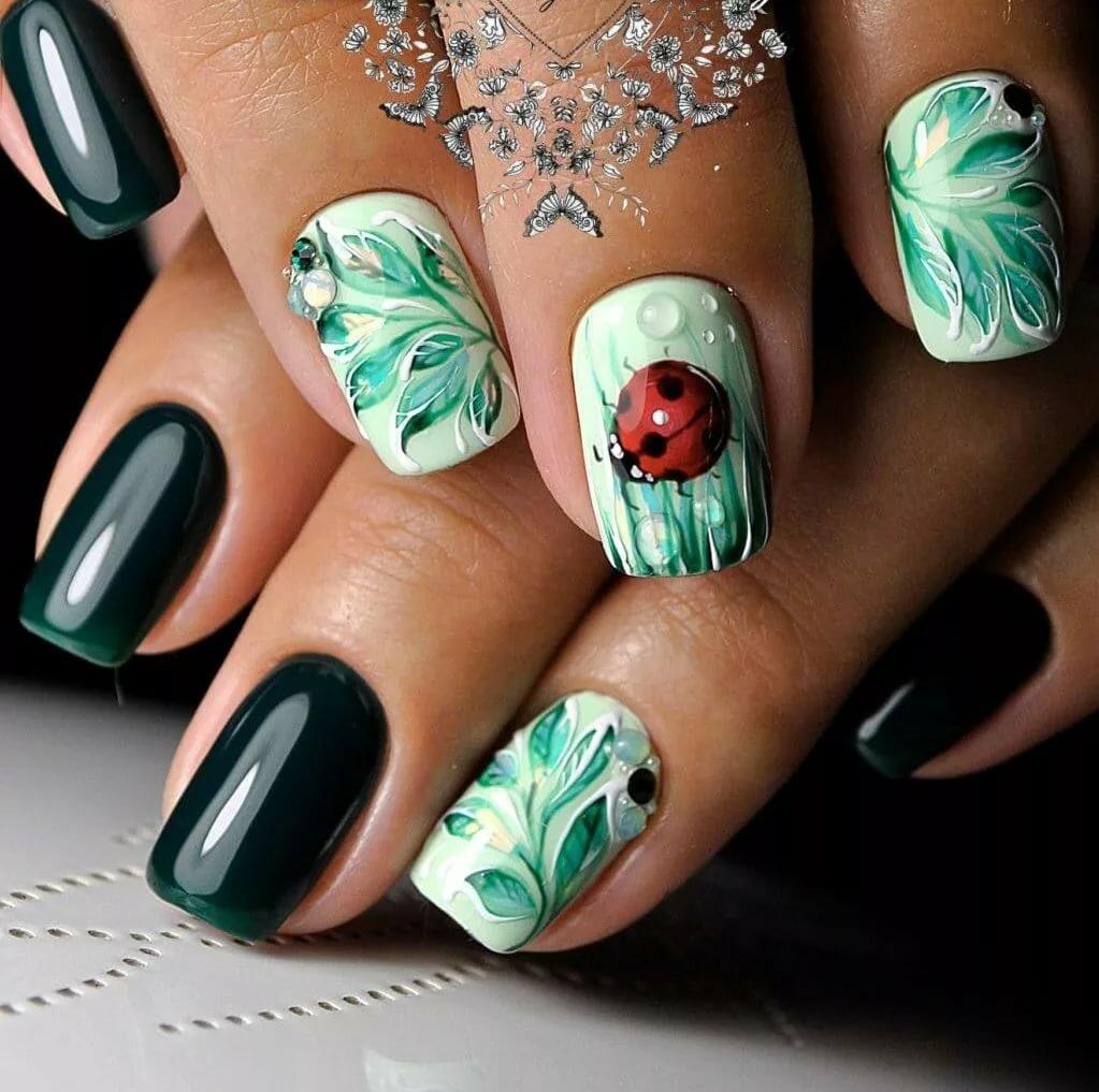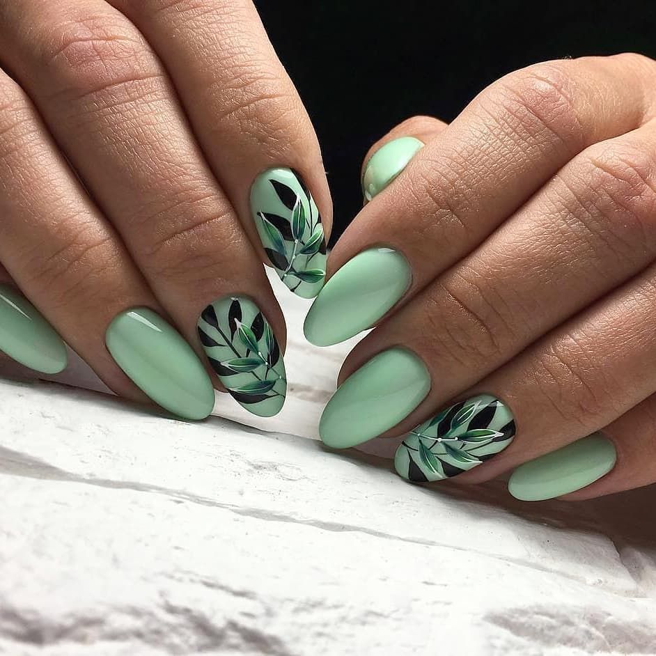 Зеленый маникюр, дополненный рисунком, мгновенно становится более интересным. Самыми трендовыми идеями изображений стали три тематики: