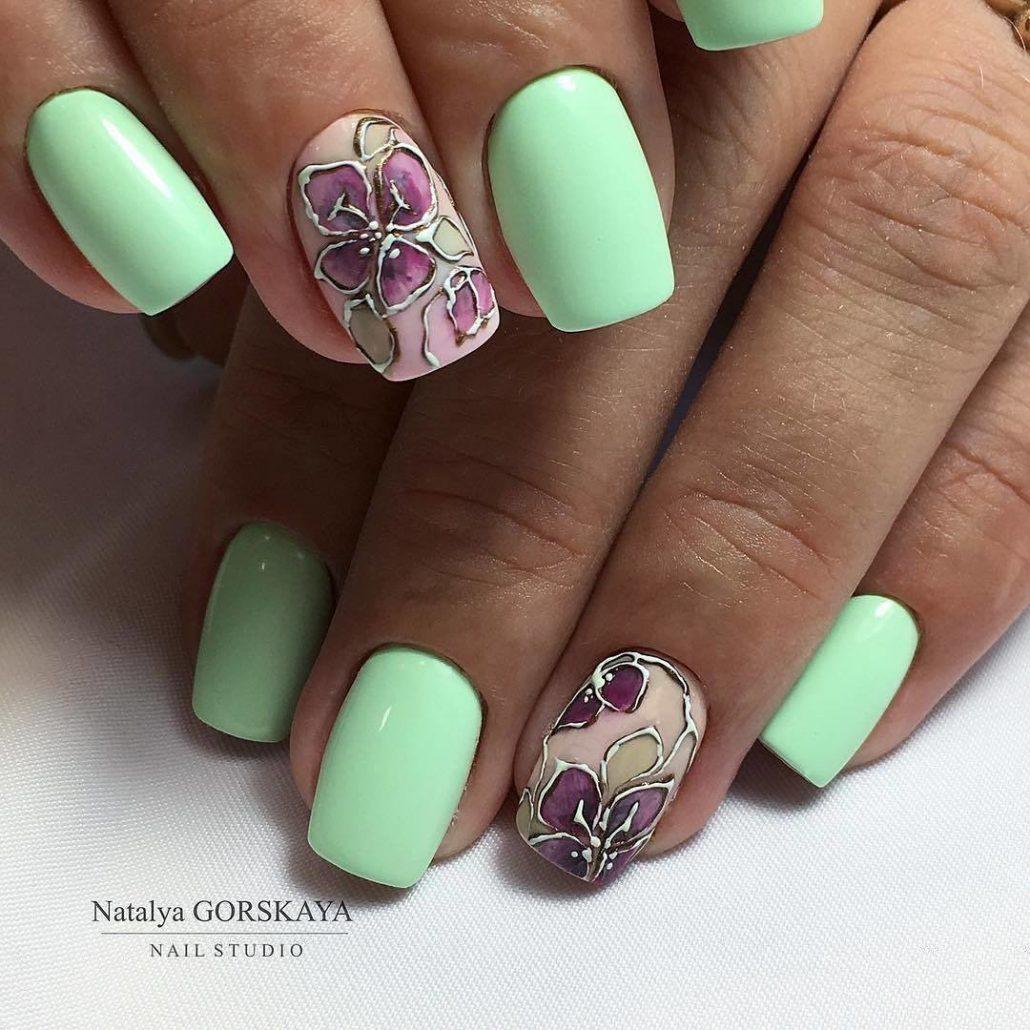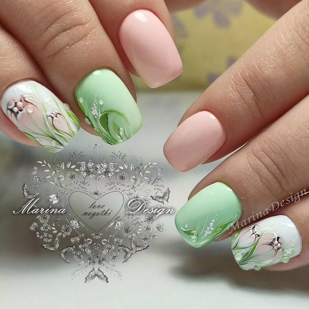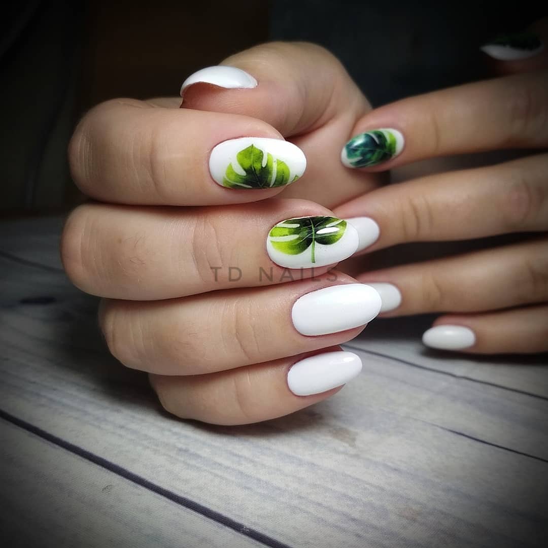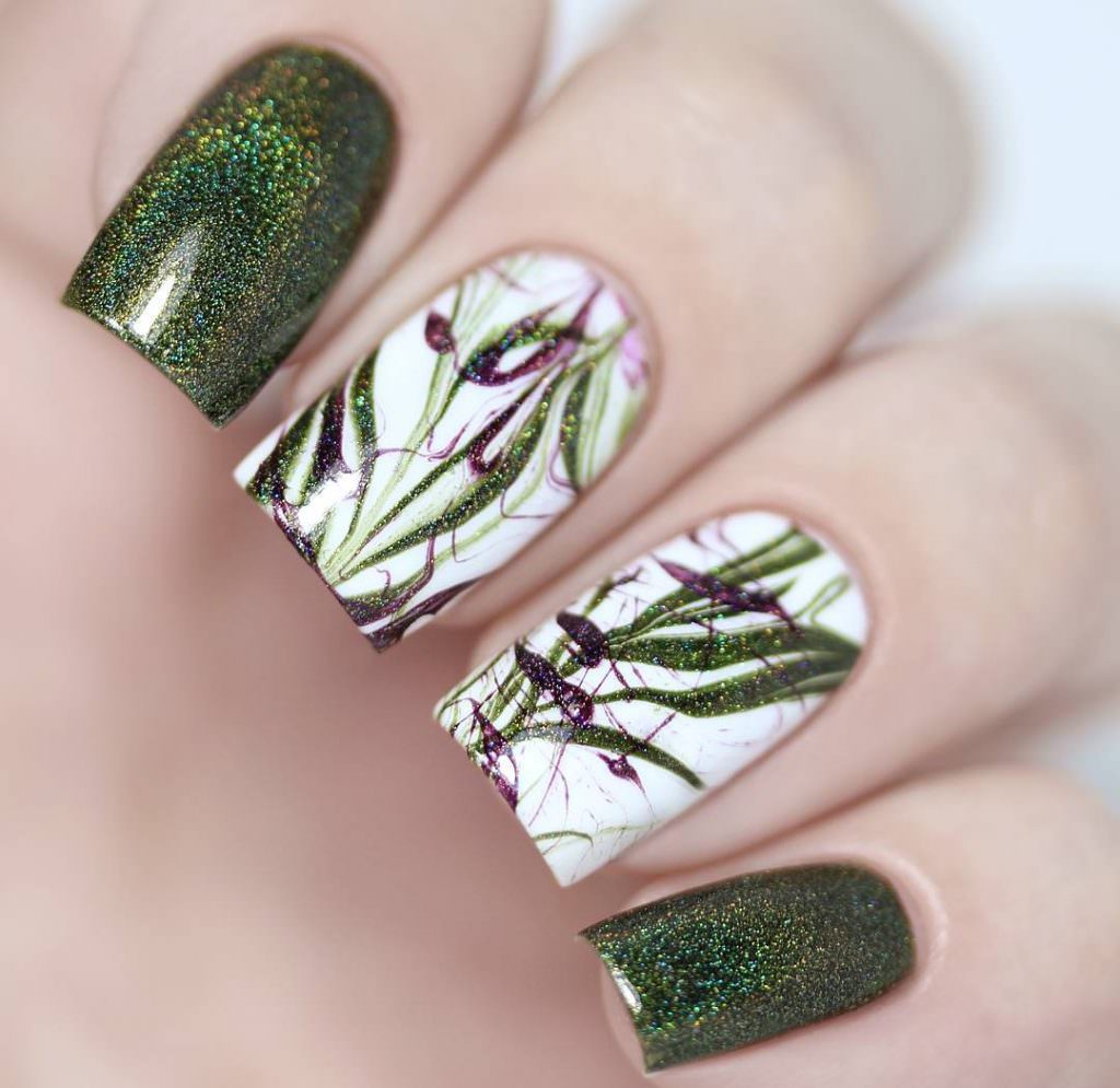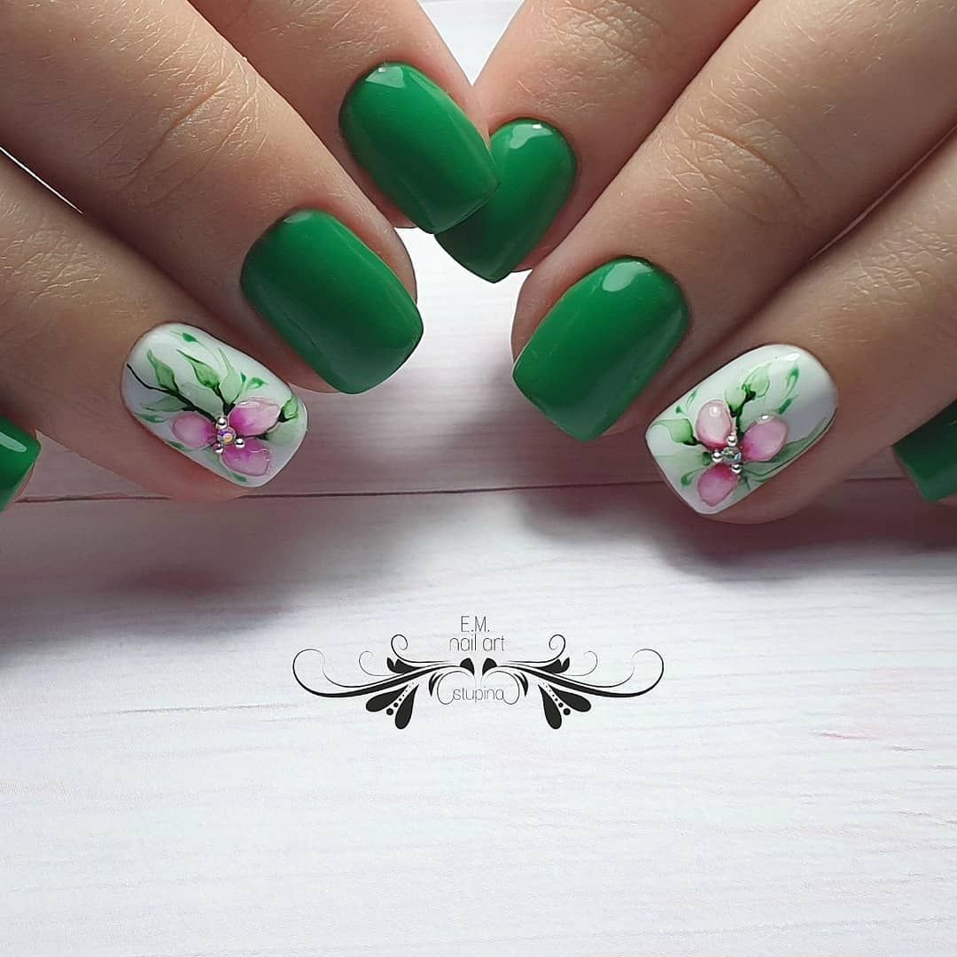 Зеленый маникюр, дополненный рисунком, мгновенно становится более интересным. Самыми трендовыми идеями изображений стали три тематики: