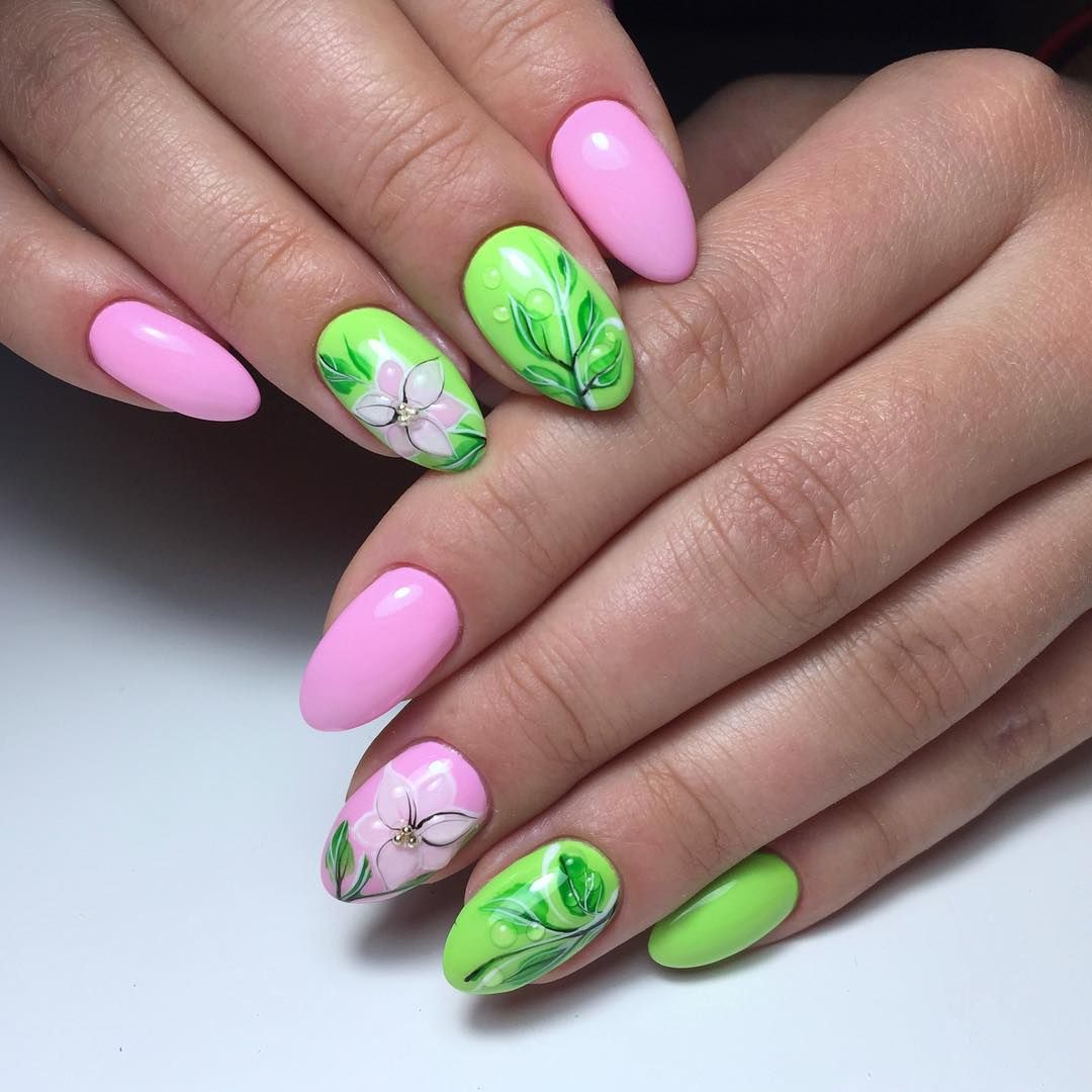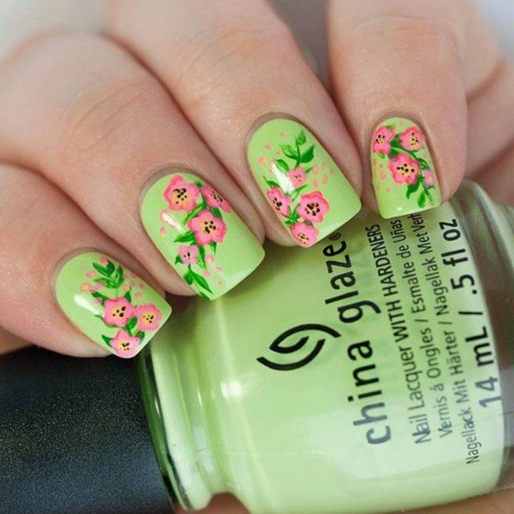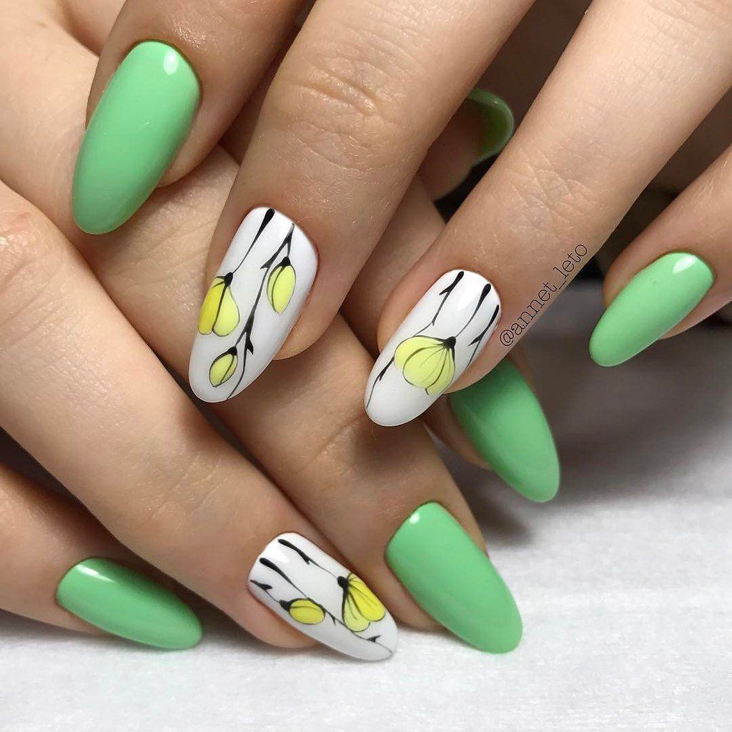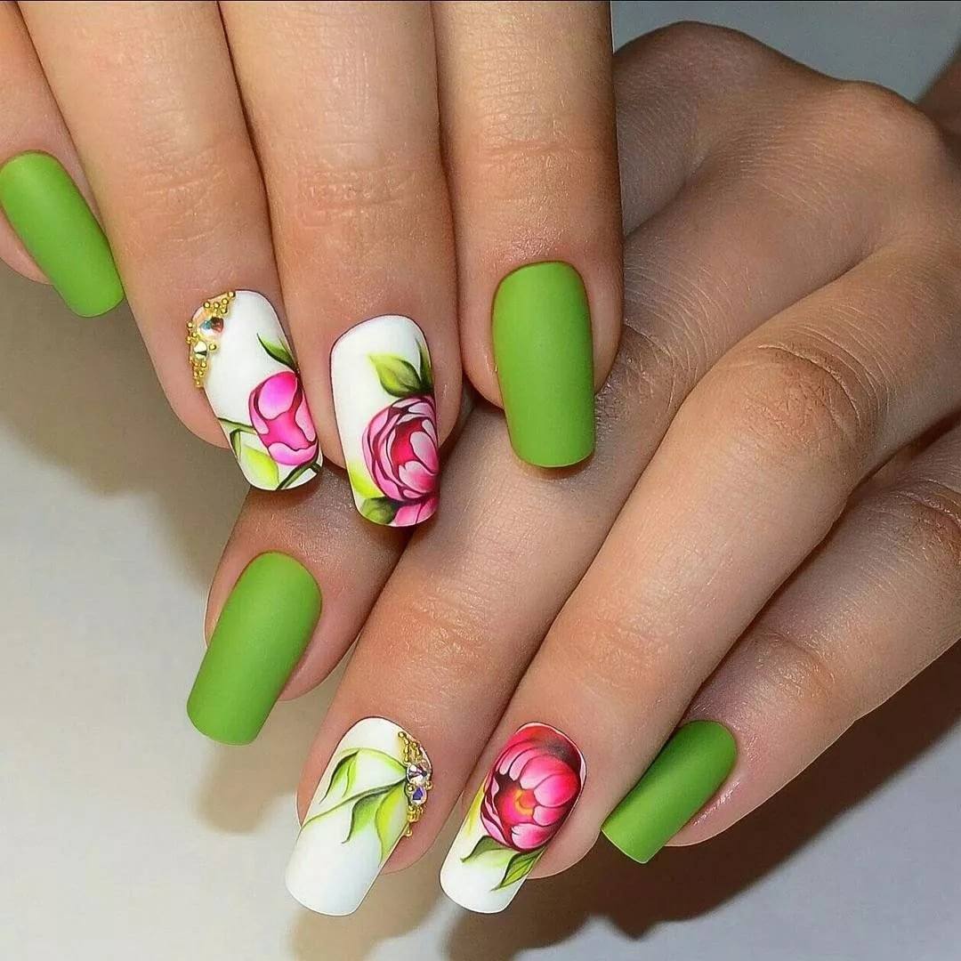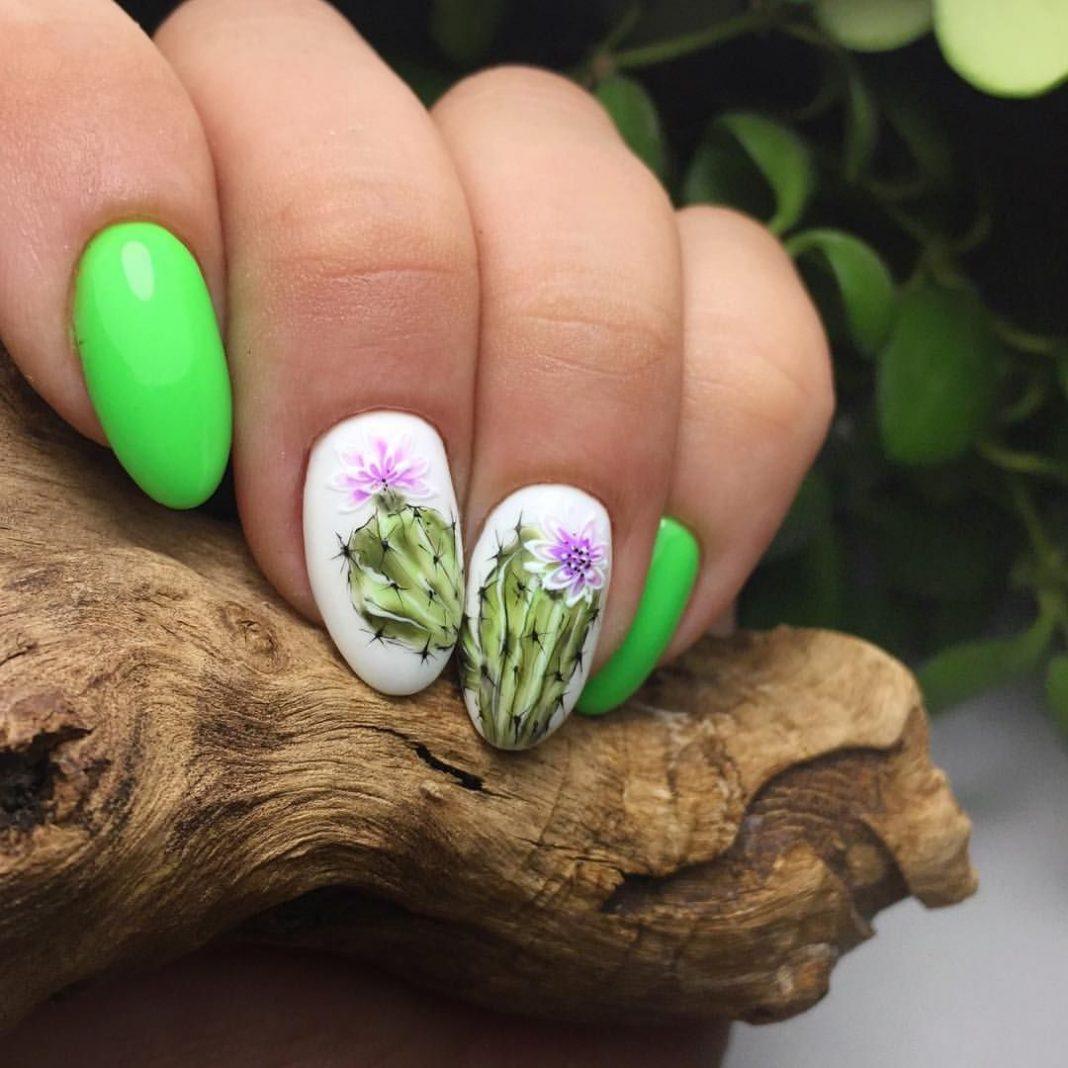 Зеленый маникюр, дополненный рисунком, мгновенно становится более интересным. Самыми трендовыми идеями изображений стали три тематики:
