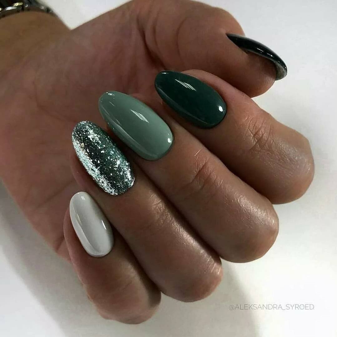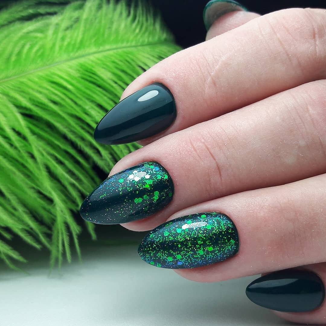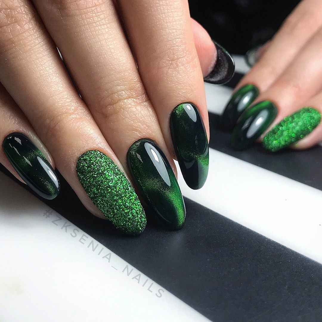 Глиттерные блестки в этом примере очень красиво украсят несколько ногтей, и их можно использовать непосредственно для создания растяжек. Маникюр «кошачий глаз» с дополнительными блестящими акцентами — идеальное дополнение к любому вечернему образу. Дизайн ногтей с кусочками «негативного пространства» будет выглядеть так же привлекательно, как зеленый лак. Это могут быть цветные узоры, штрихи или «островки» необычной формы на бесцветной основе с мазками блестящего жидкого глиттера, или прозрачные фигуры на зеленом фоне. При этом особенно эффектно и оригинально смотрятся «голые» участки на матовых поверхностях. Аккуратно украсьте контур блестками и наслаждайтесь результатом.