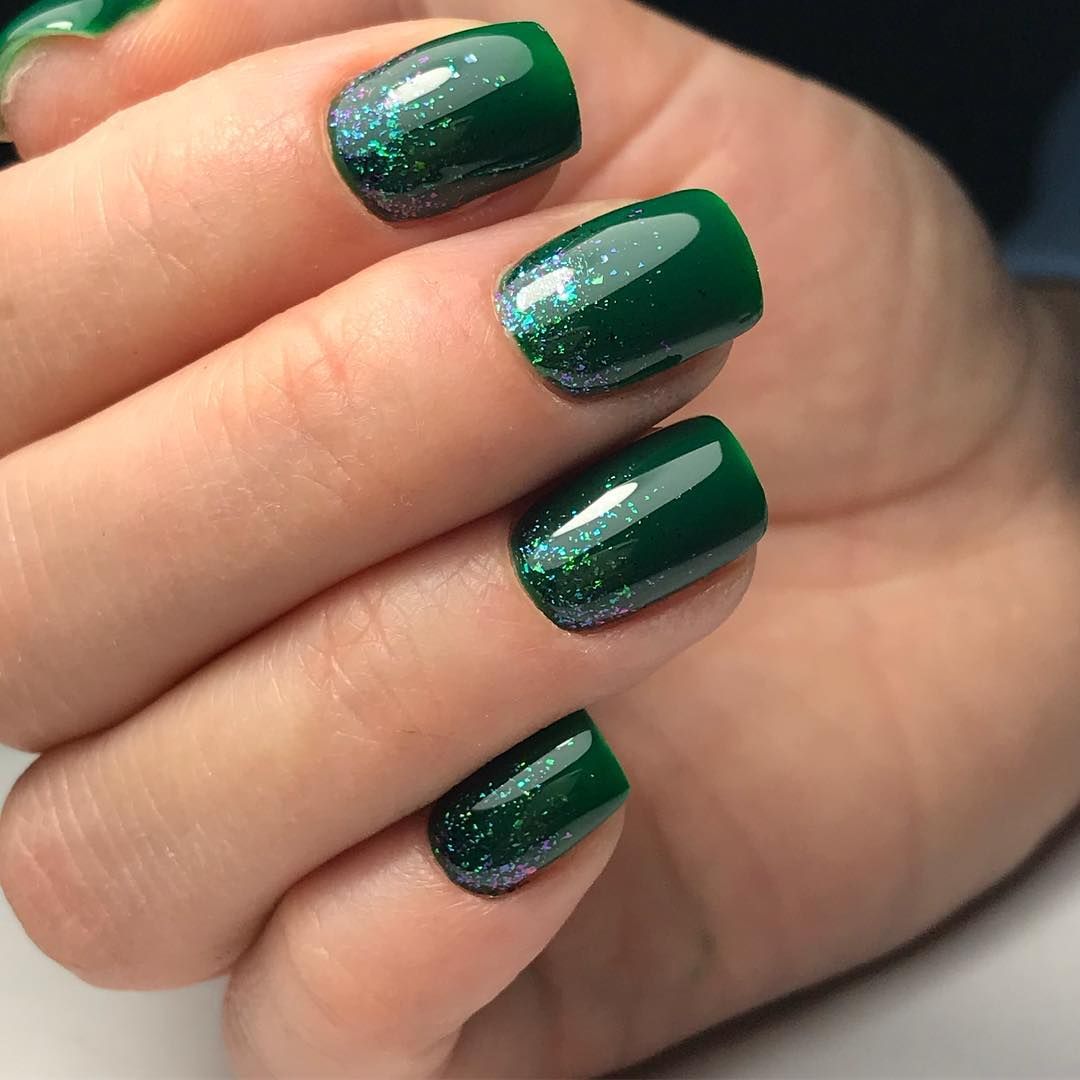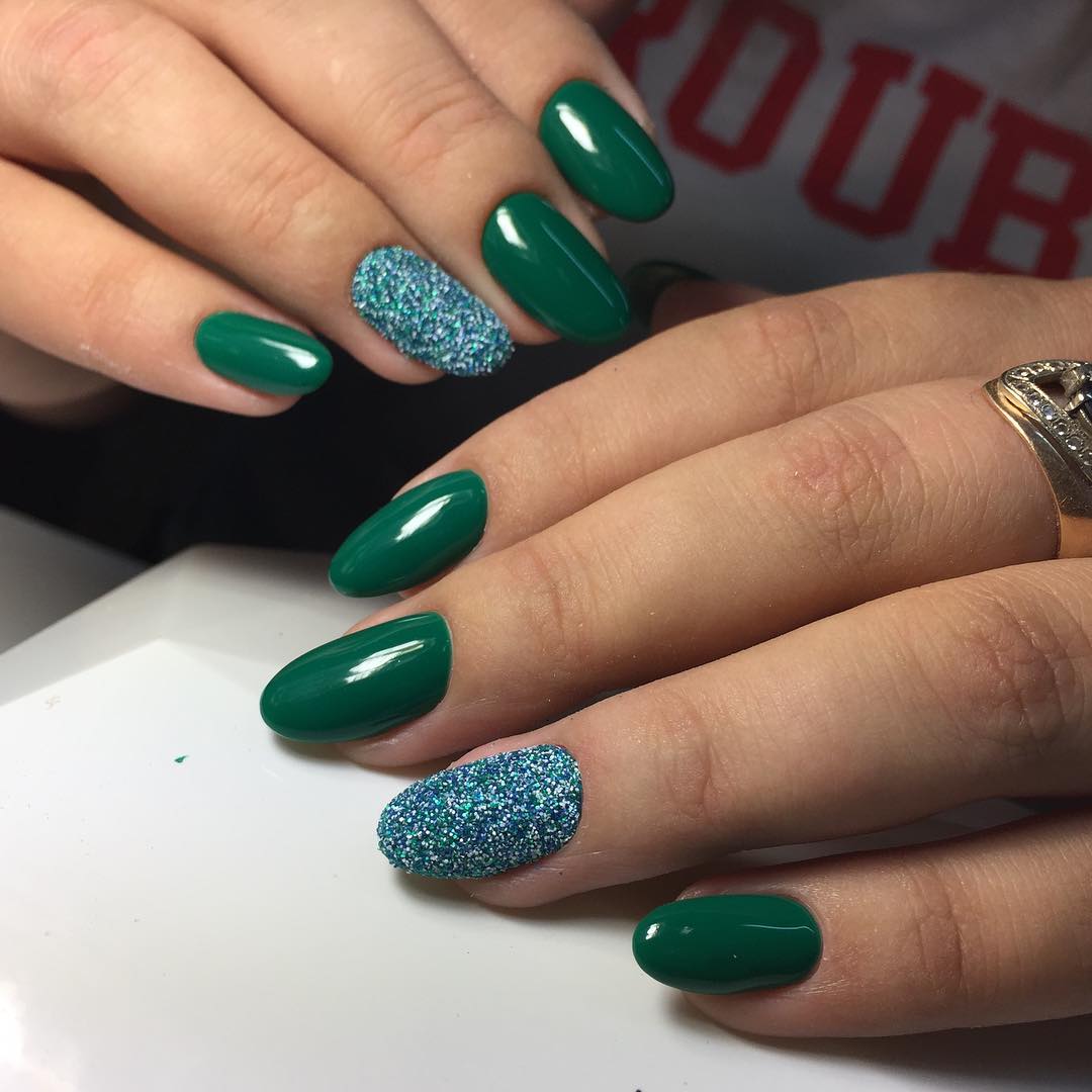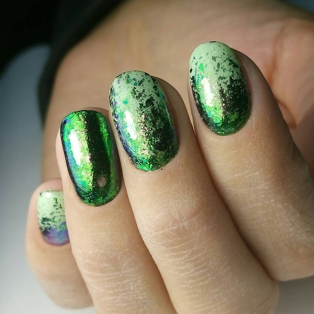 Еще один главный тренд в зеленом маникюре – использование эффекта битого стекла. Подобный вариант смотрится особенно выигрышно в темном исполнении. В случае с темно-зеленым лаком он дает богатые переливы синего, черного и фиолетового цветов.
