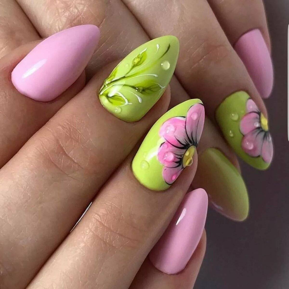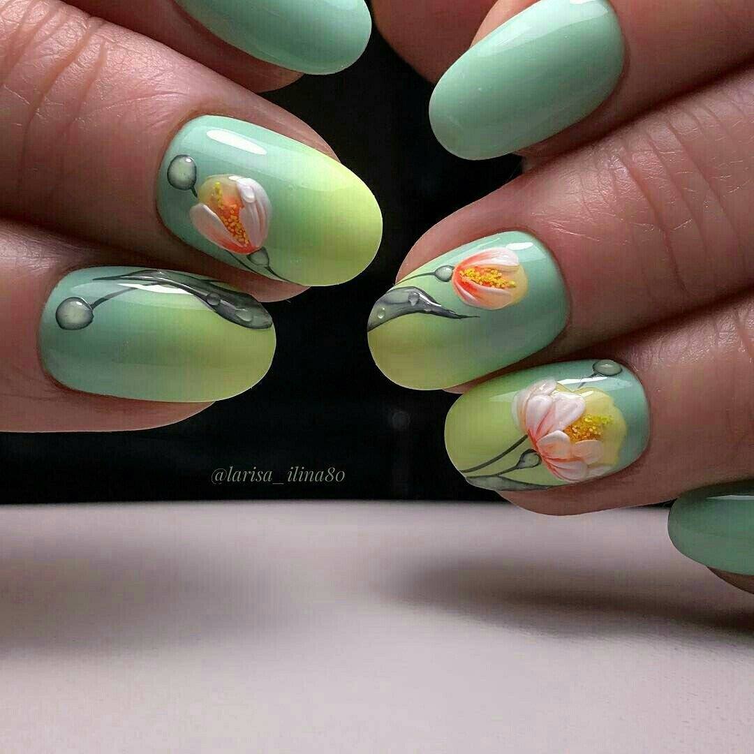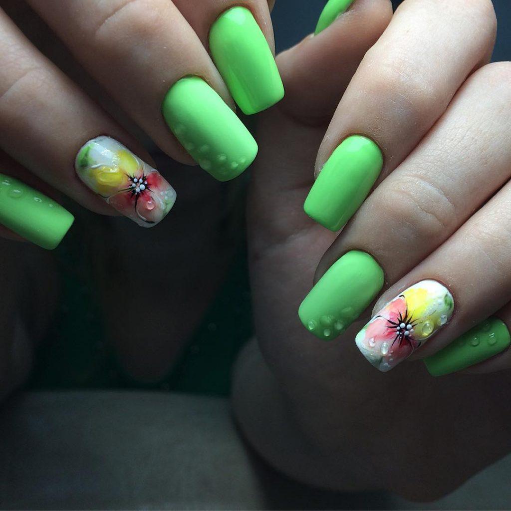 Нанесите салатовый на все ногти и просушите. Помощью цветников прорисуйте реалистичный цветок с крупными лепестками, покройте матовым топом. На поверхности лепестков поставьте глянцевые капли, имитирующие росу, или обведите глянцевым топом очертания рисунка для эффекта объёма.
