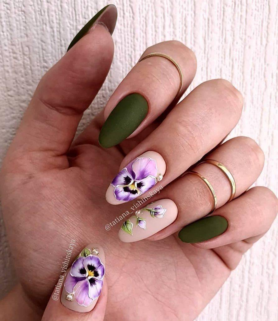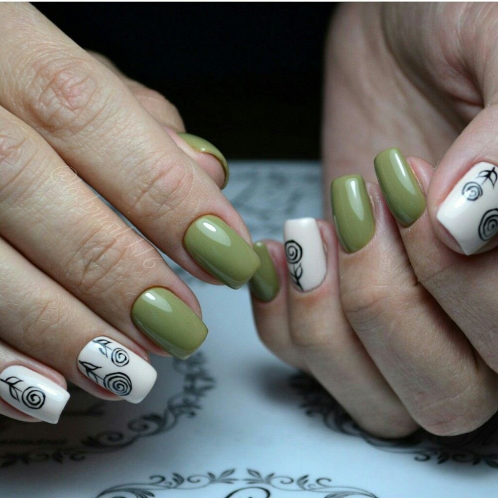 Оттенки оливкового с разными бутонами — отличная идея, которая как никогда актуальна в этом сезоне. Другой топ позволяет сделать свой маникюр оригинальным и необычным, не тратя зря время и деньги.