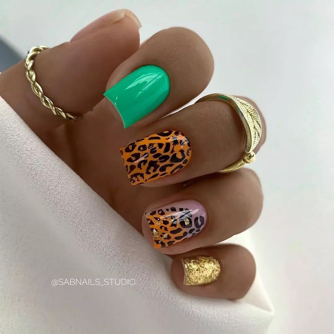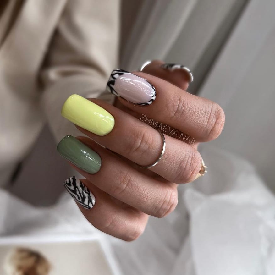 Звериный принт может, не самое очевидное сочетание, но выглядит очень эффектно. Особенно стильным является сочетание неонового салатово фона и черных леопардовых пятнышек. А вот сочетание реалистичного животного принта в коричнево-бежево-желтых тонах и зеленого лака не самая удачная затея, если вы не поклонница китча.