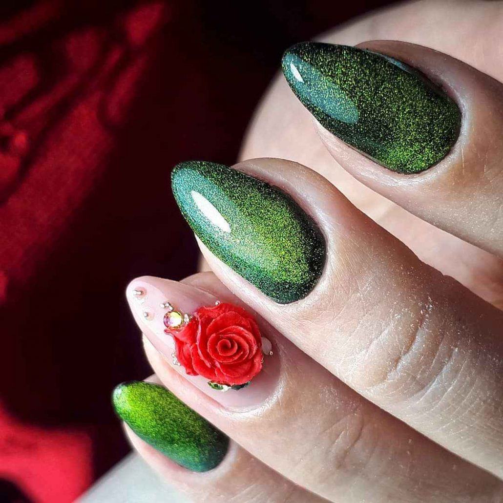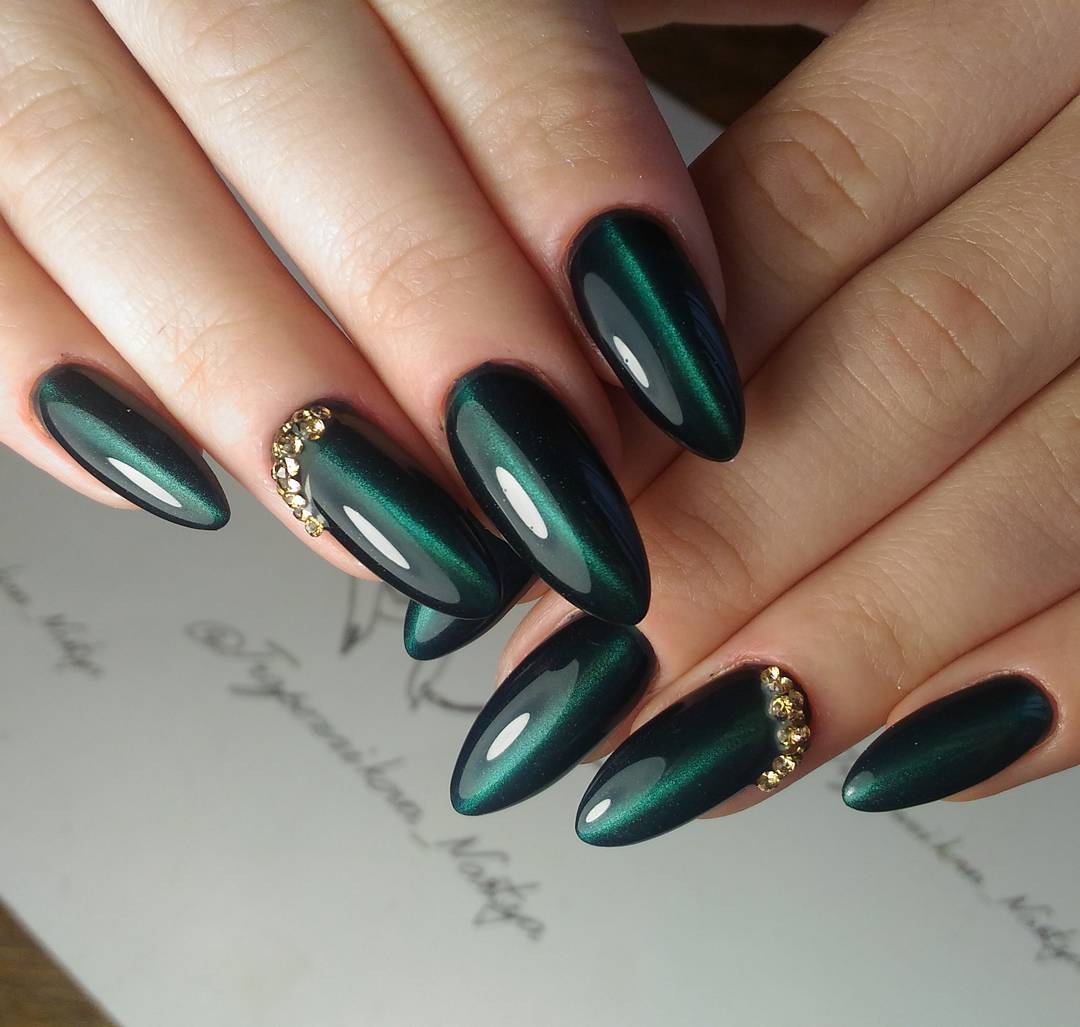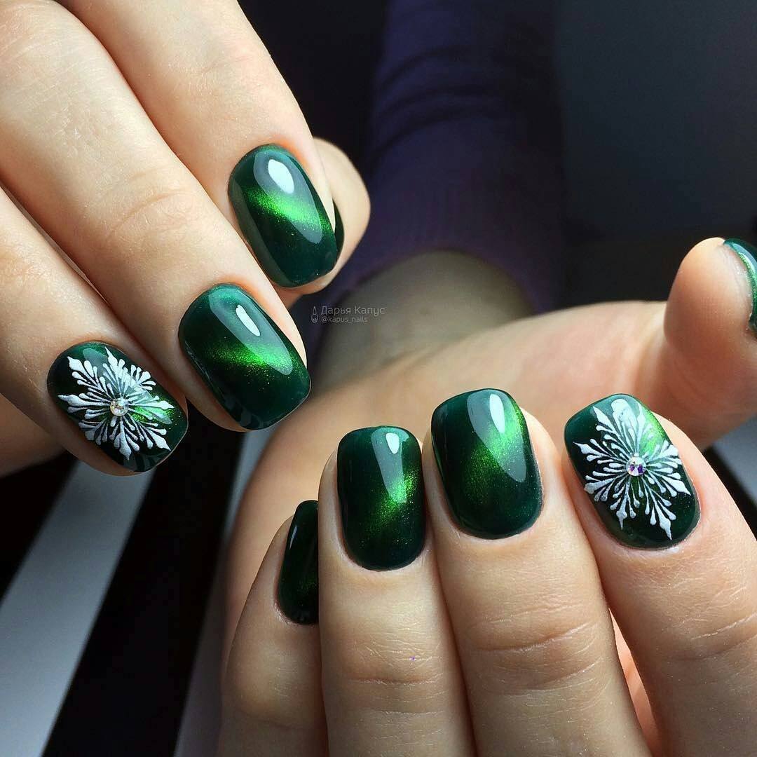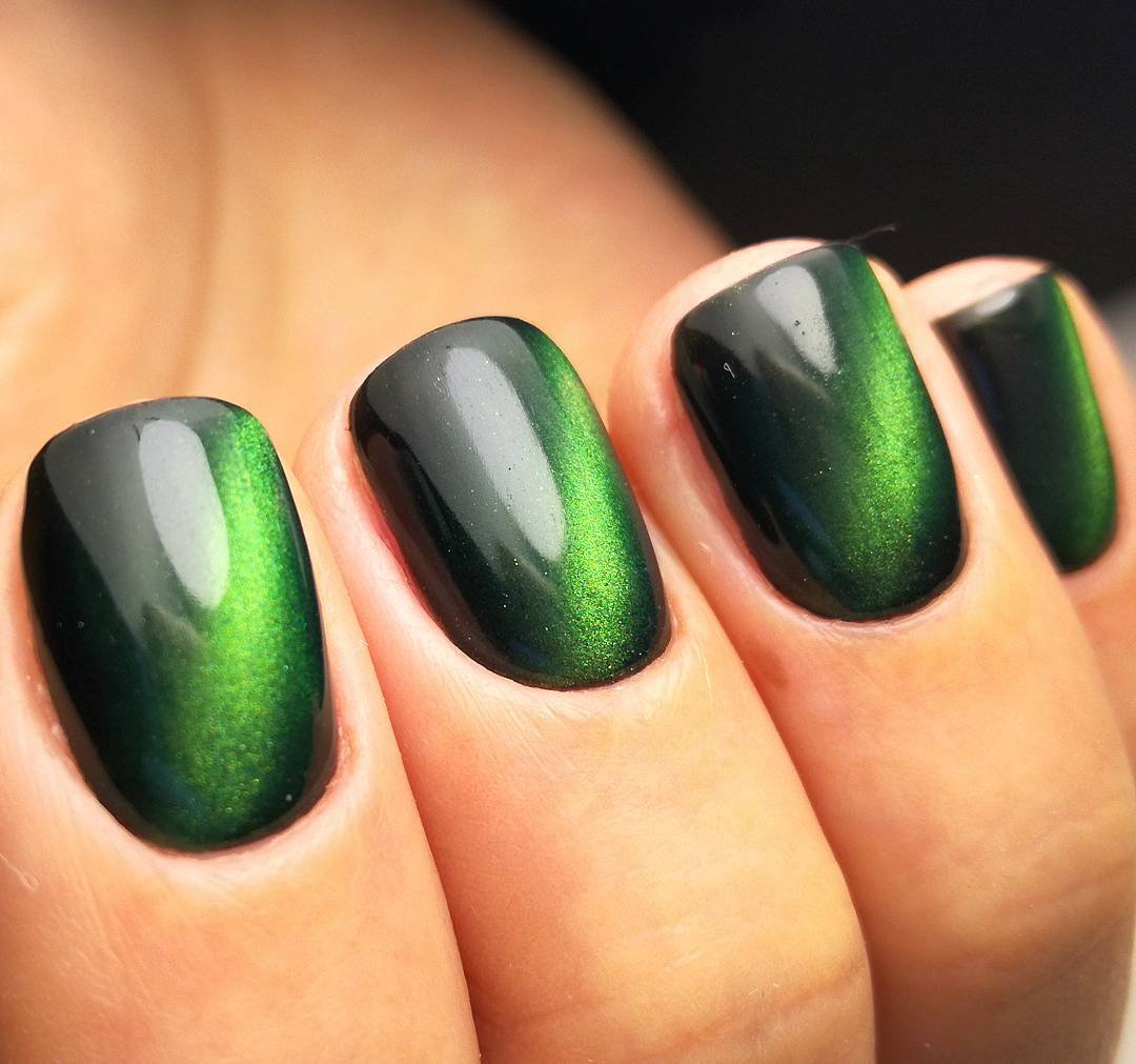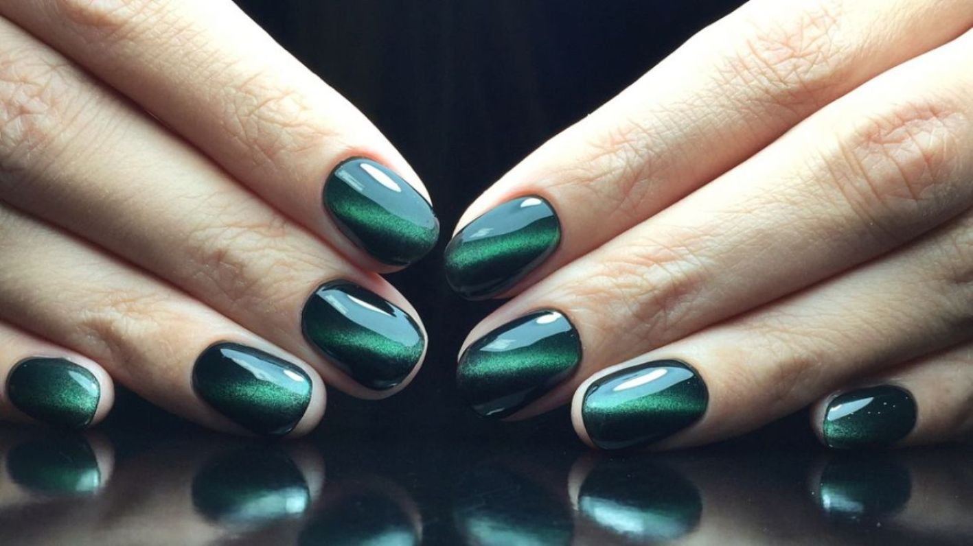 В 2020 – 2021 году дизайн «кошачий глаз» стал лидером в разнообразии темно-зеленого маникюра. Несмотря на то, что данный нейл-арт пользуется спросом не первый год, его популярность продолжает набирать обороты. Главные достоинства «кошачьего глаза» – универсальность и возможность комбинировать его с другими тонами (сочетание с глиттером, лунным рисунком). Такой дизайн придает образу женщины лаконичность и аристократичность. Насыщенность и глубина цвета уникальны и могут обойтись без лишнего декора. В этом сезоне самыми популярными стали сапфировый и темно-еловый оттенки, поскольку визуально создают 3D эффект.
