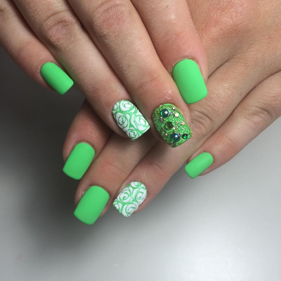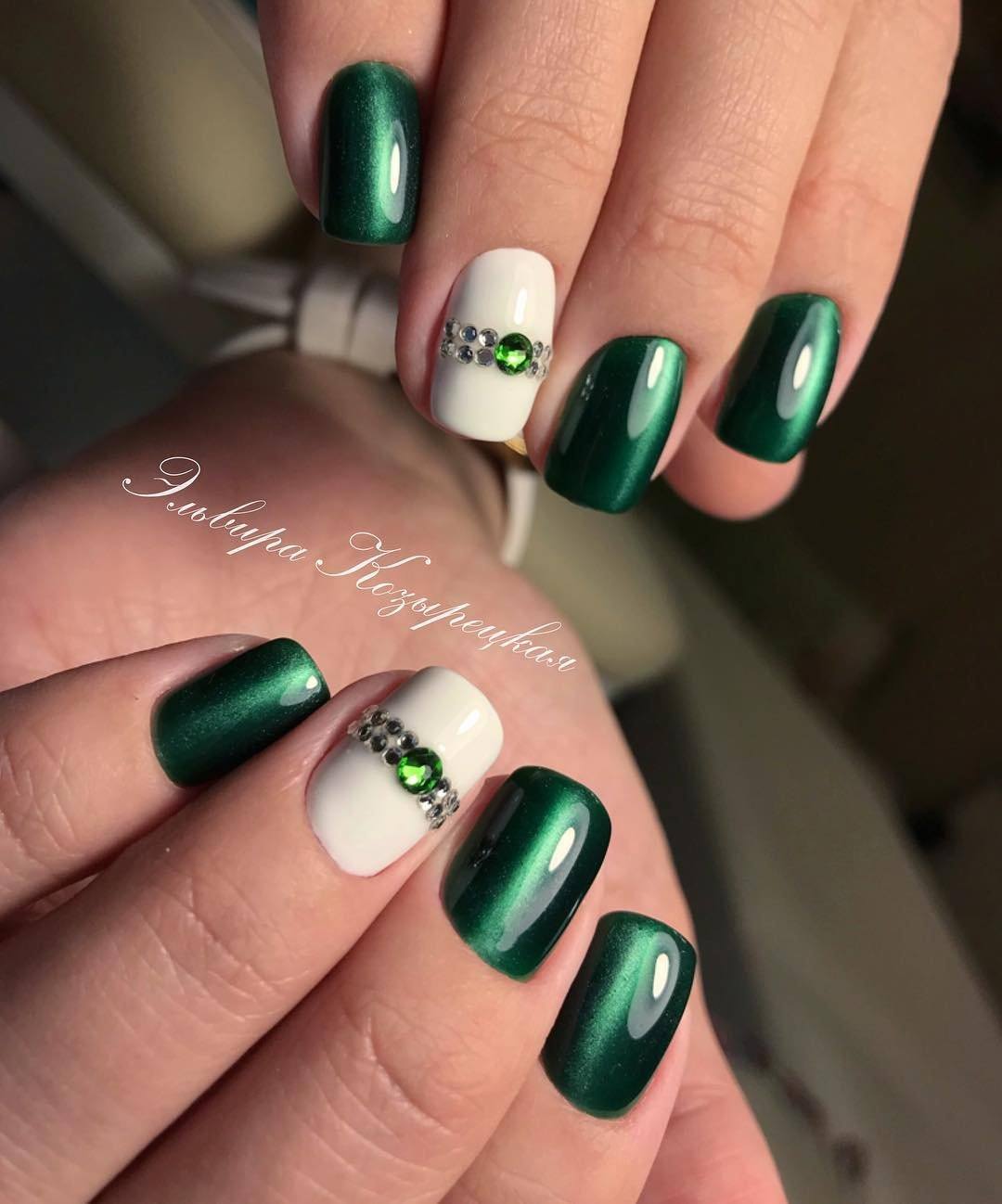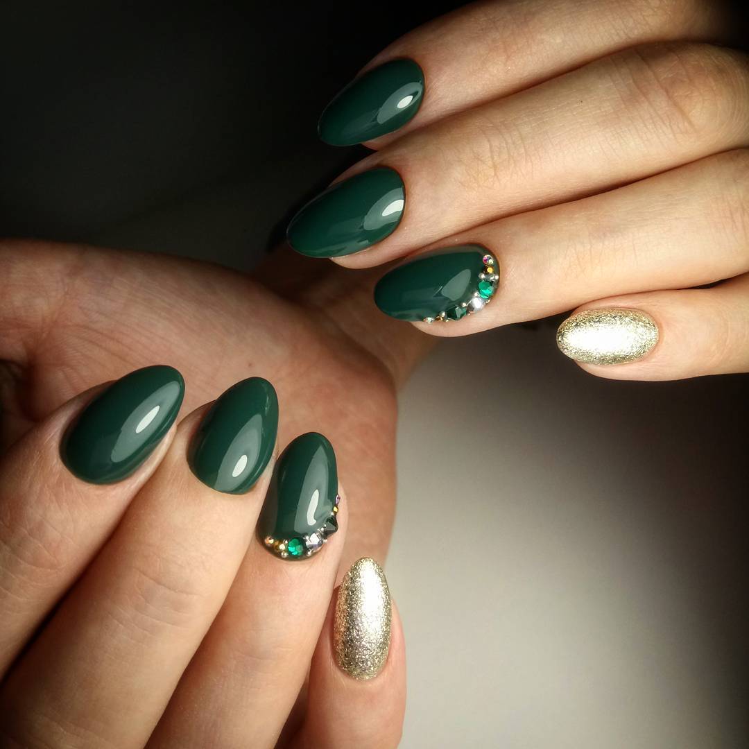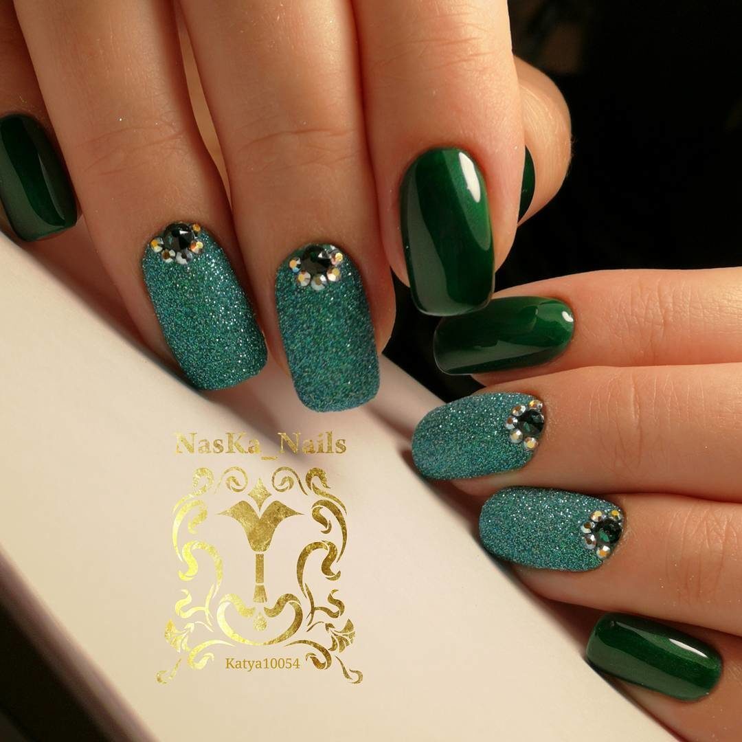 Чтобы сделать зелёный дизайн ногтей вечерним, добавьте на ноготь выкладку из страз. В сочетании с оттенками neon или салатовым камни смотрятся странно, но глубокие изумрудные или пастельные тона стильные кристаллы только преобразят.