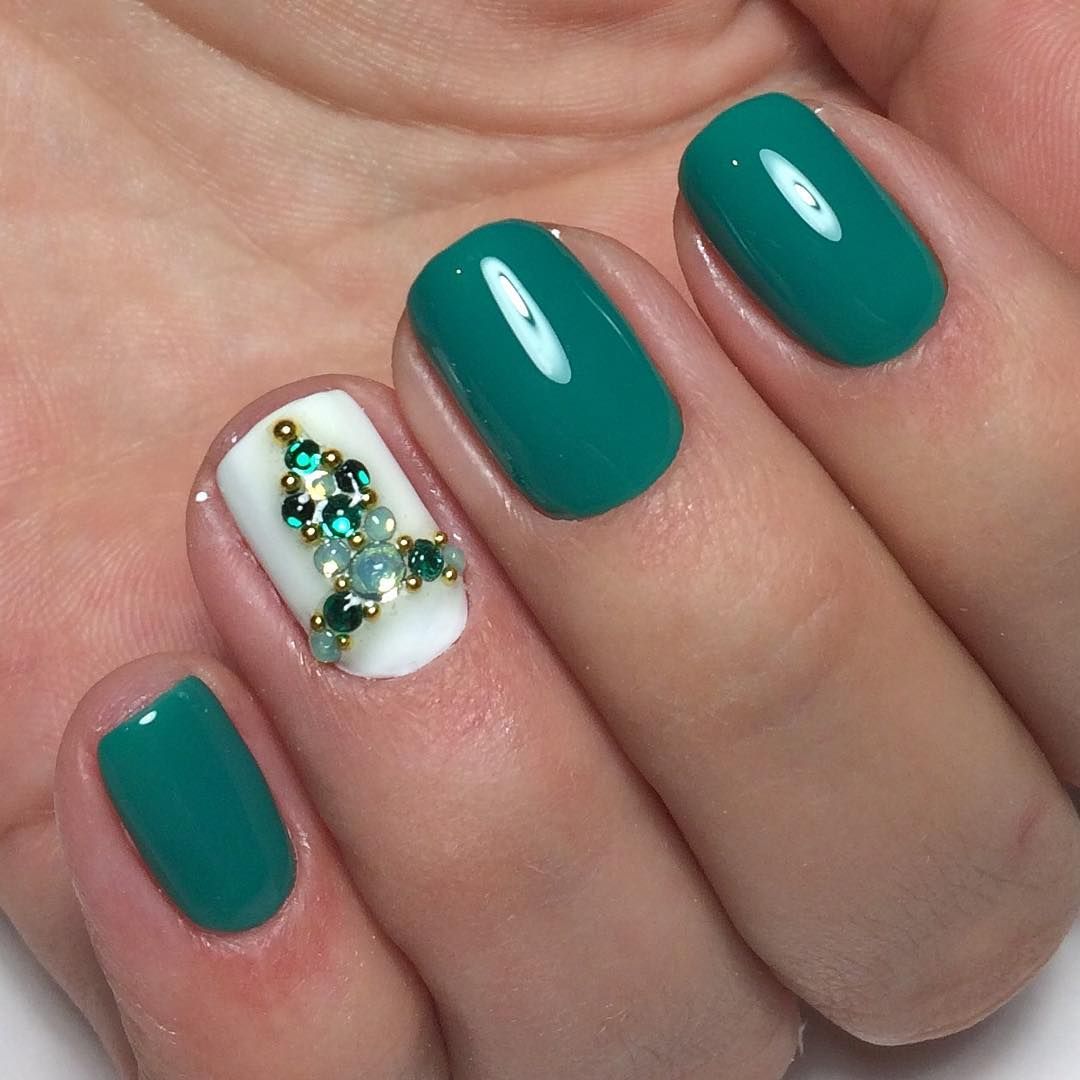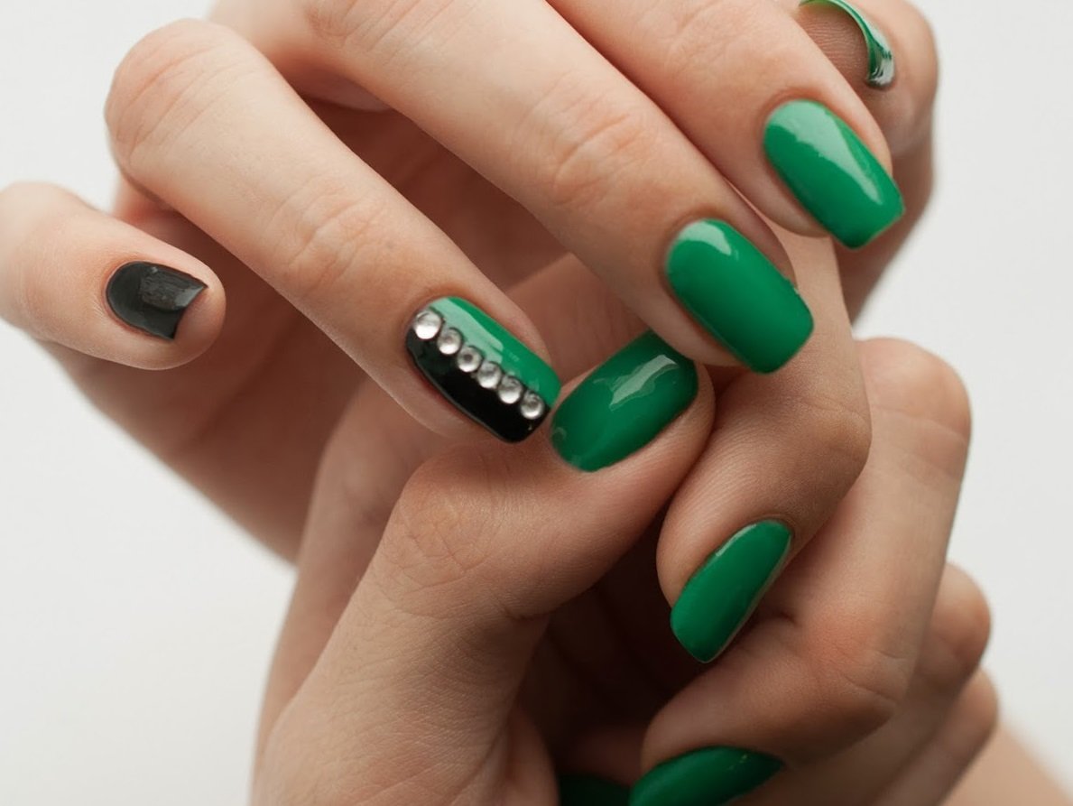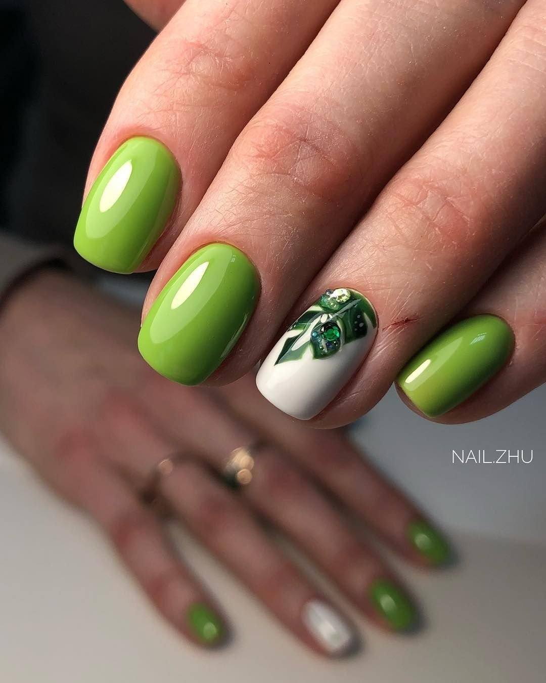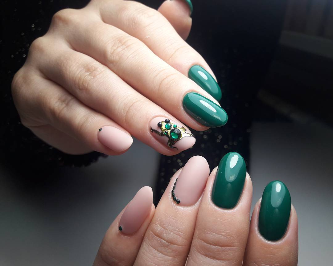 Чтобы сделать зелёный дизайн ногтей вечерним, добавьте на ноготь выкладку из страз. В сочетании с оттенками neon или салатовым камни смотрятся странно, но глубокие изумрудные или пастельные тона стильные кристаллы только преобразят.