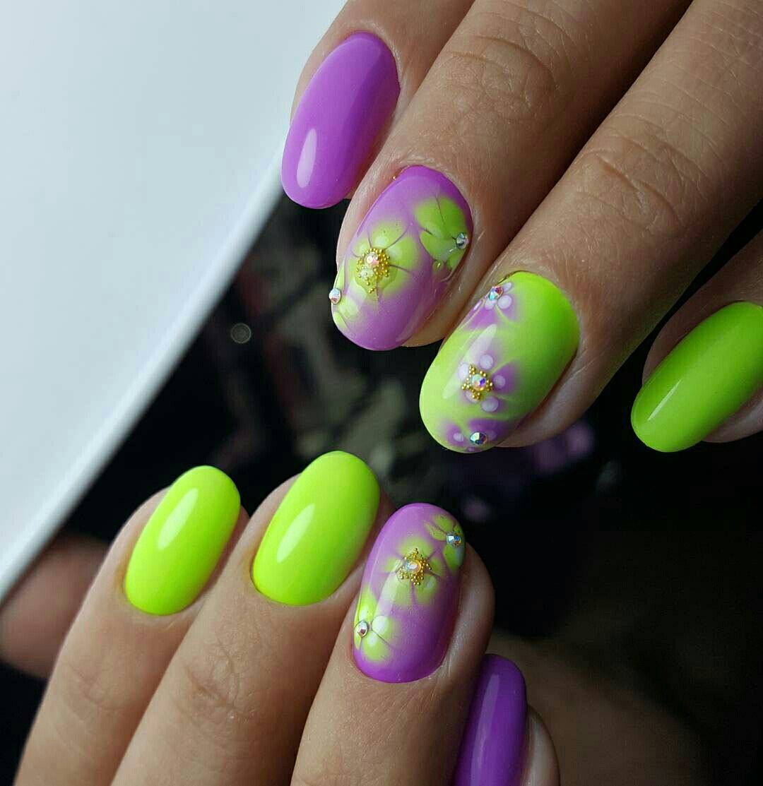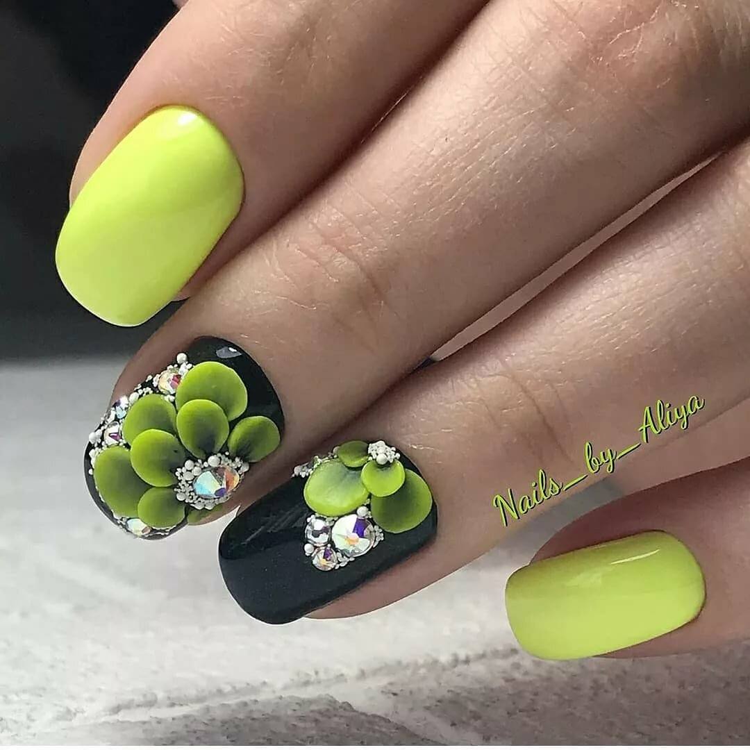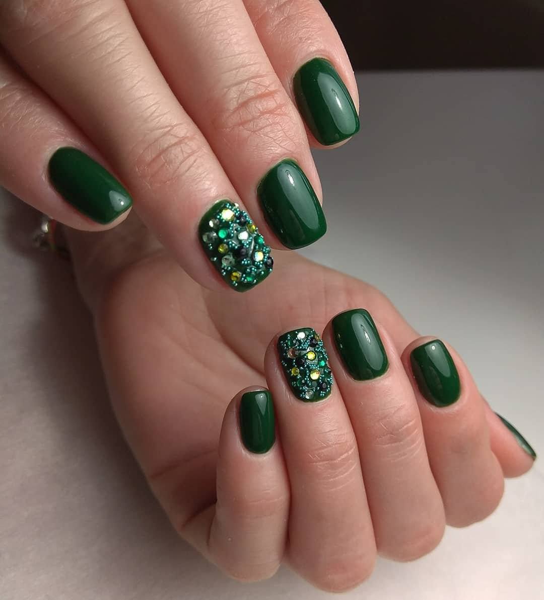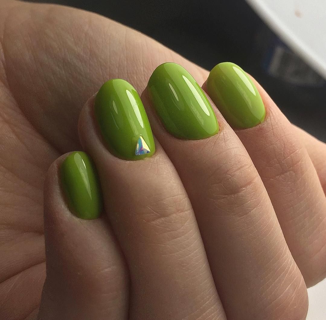 Чтобы сделать зелёный дизайн ногтей вечерним, добавьте на ноготь выкладку из страз. В сочетании с оттенками neon или салатовым камни смотрятся странно, но глубокие изумрудные или пастельные тона стильные кристаллы только преобразят.