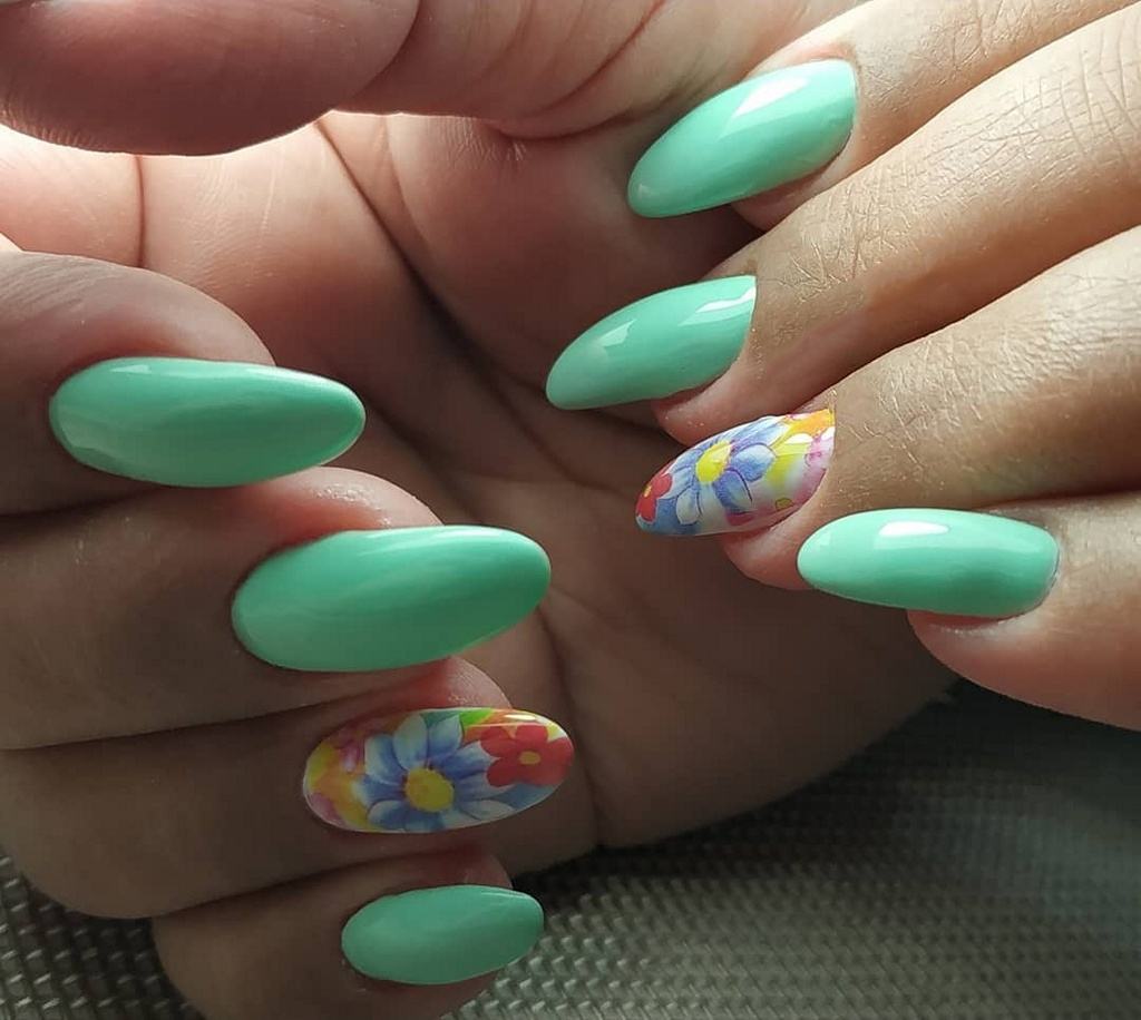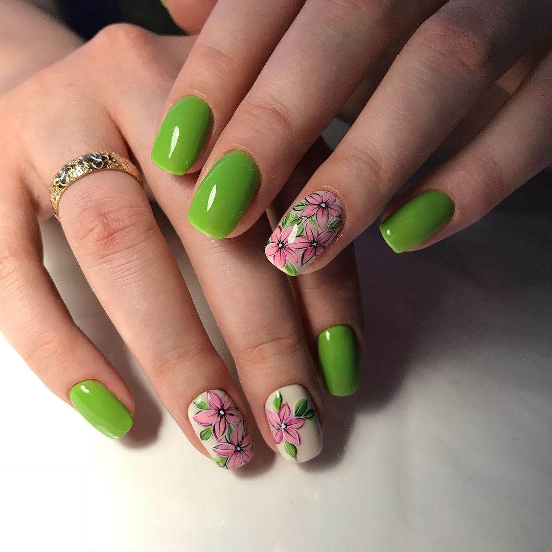 Самый безопасный способ использования зеленого цвета в маникюре – акцентирование одного-двух пальцев руки. Подобное решение смотрится свежо и очень интересно. Ну, а чтобы окончательно избежать каких-либо рисков с использованием зеленого лака – дополнительно декорируйте зеленый фон каким-нибудь орнаментом или ведущим цветом маникюра.