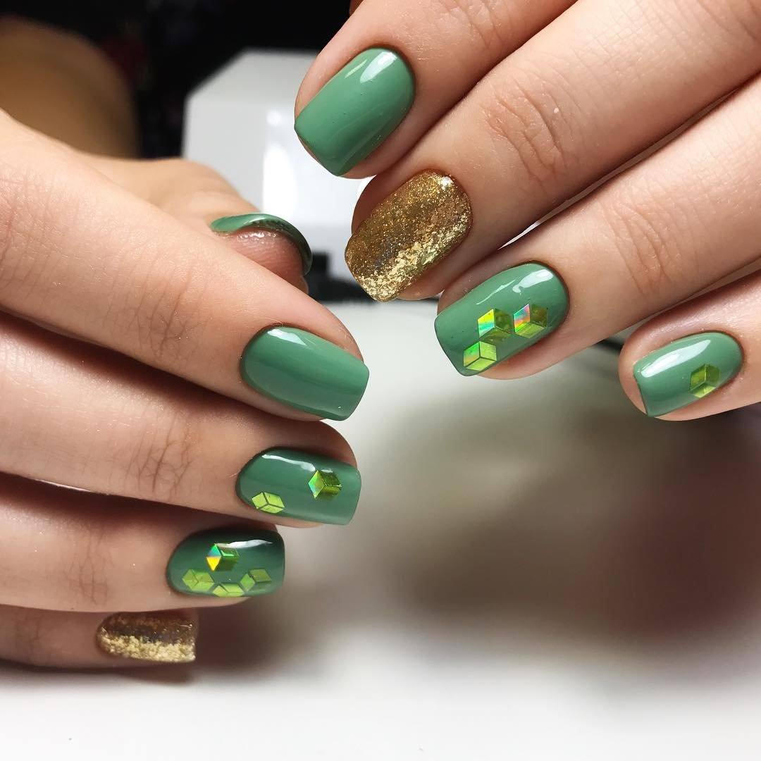Втирка. Зеленый с золотым маникюр смотрится хорошо на коротких ногтях, но и на средних будет выглядеть шикарно и по-весеннему.