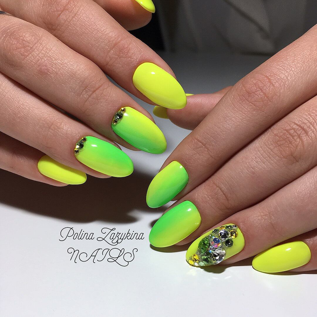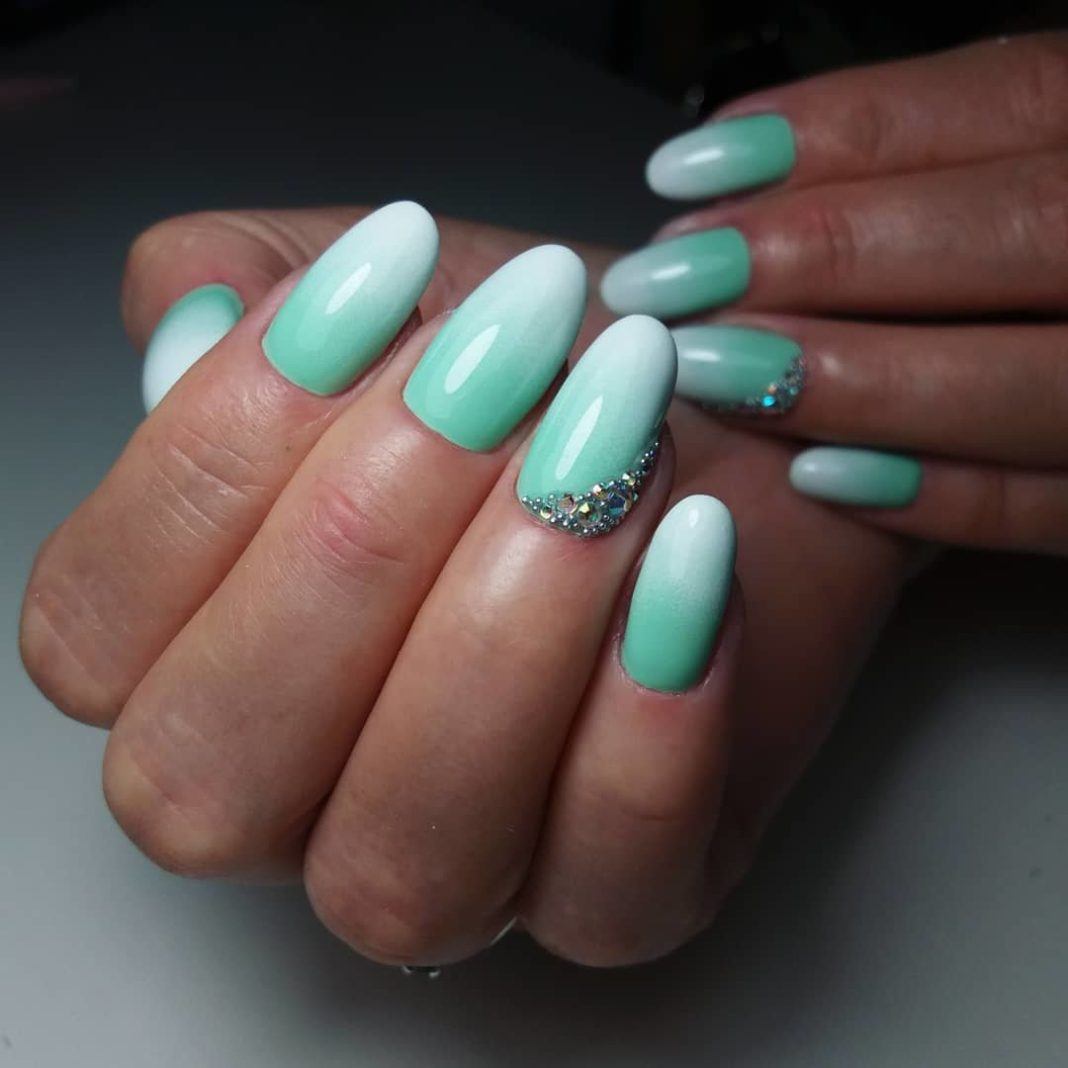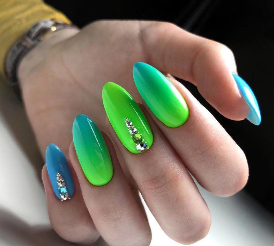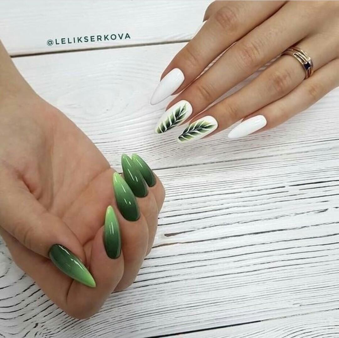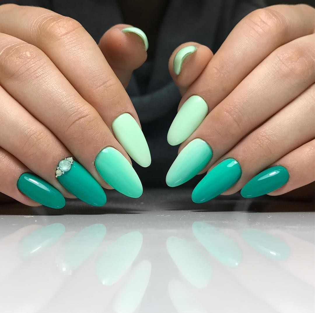 Зеленый маникюр, плавно переходящий в другой цвет, — классика, которой на средних ногтях самое место. На коротких слишком мало пространства, на длинных будет смотреться немного странно, а на средних мягкий перелив и эффект от использования разных оттенков будет неподражаем.