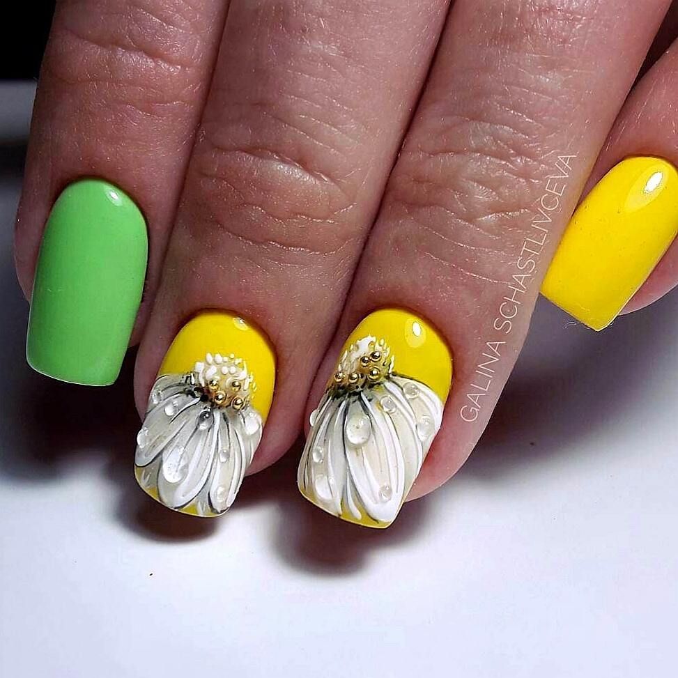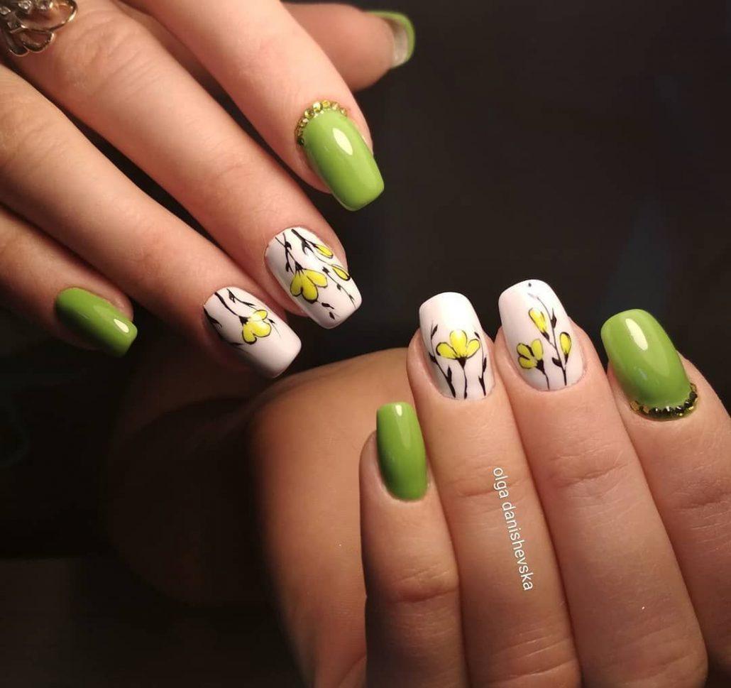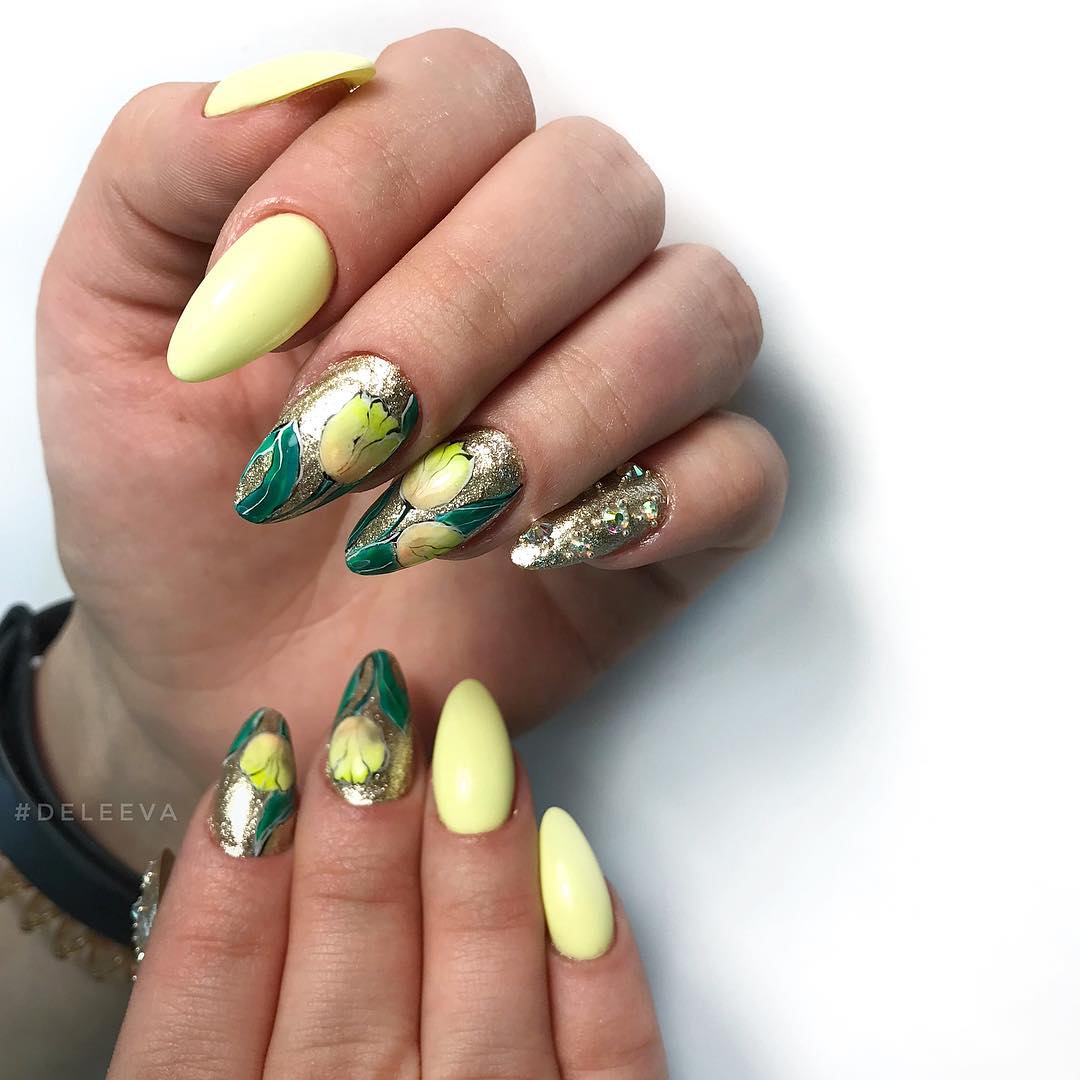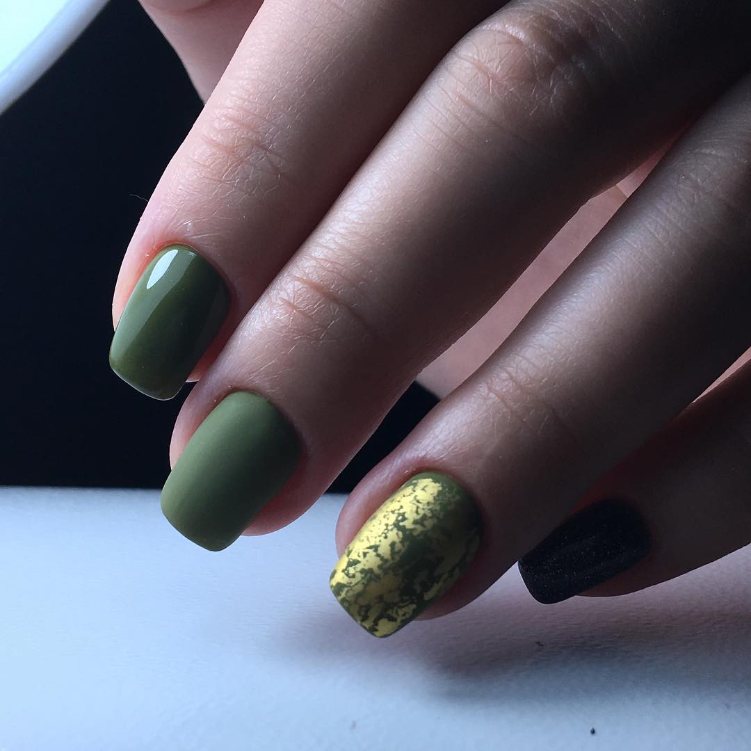 Комбинация модная — попробуйте более нежный желтый с такой же нежной оливковой — удивительное сочетание. Допустим и ярко-желтый цвет — добавьте золотистого блеска. Попробуйте переливчатые цветовые переходы от ногтя к ногтю, от оливкового до желтого.