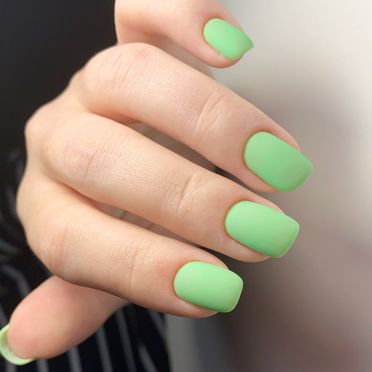 Однотонная зеленая палитра на ноготках – один из ключевых хитов сезона 2022 года. Выигрышно будет смотреться и глянцевый, и матовый зеленый маникюр на короткие ногти. Матовое покрытие эффектнее будет выглядеть в мятном, бирюзовом и болотном колере. При создании однотонного зеленого маникюра ключевое – это выбор правильного оттенка.