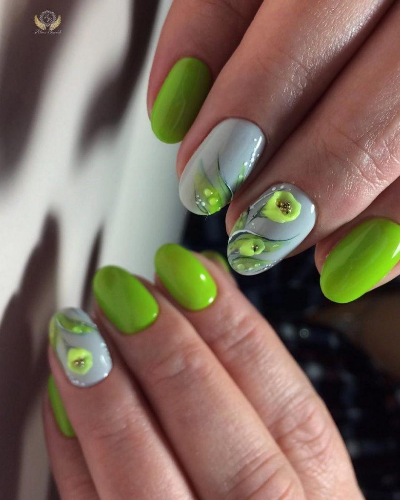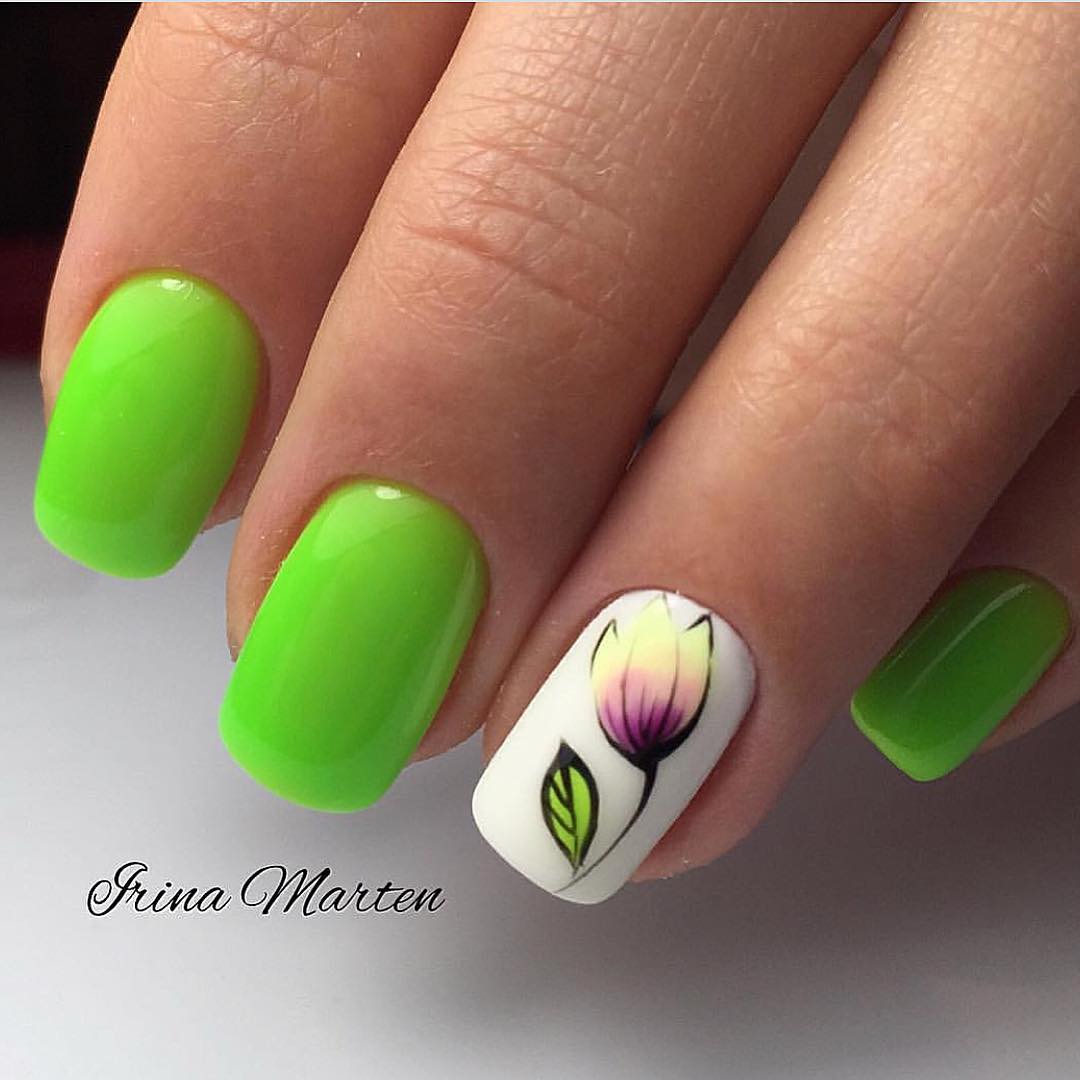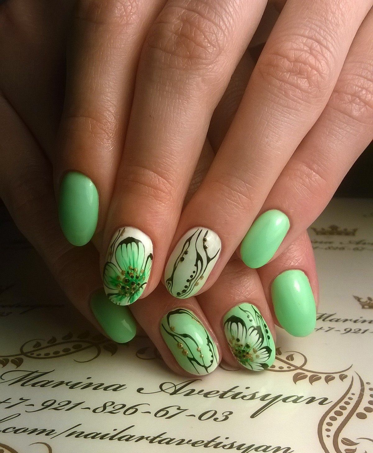 Самый простой способ в плане решения использования зеленого цвета в маникюре, но при этом самый непростой в отношении техники исполнения – дизайн ногтей с зеленым цветом (фото). Дизайн может быть нескольких вариантов – рисунок контрастного цвета на зеленом фоне, или наоборот, зеленый цвет может использоваться в качестве акцента на ногтях, окрашенных в оттенок отличного зеленого спектрального ряда. Но, пожалуй, самый интересный вариант будет достигнут при использовании разных оттенков зеленого в одном маникюре.