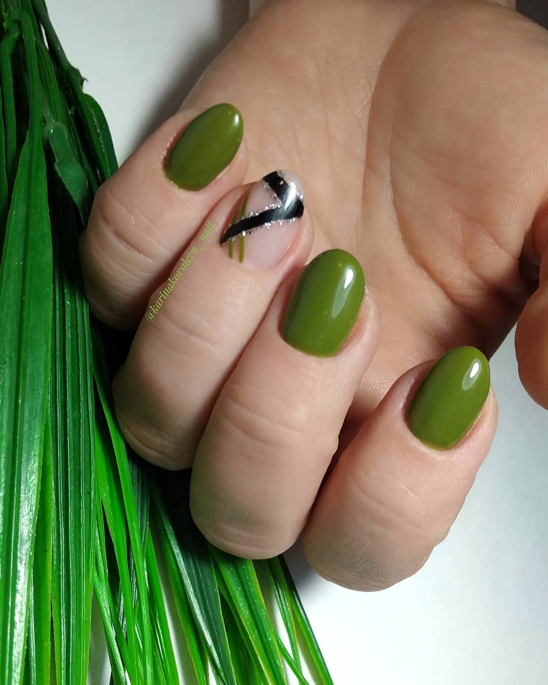 Наиболее естественное сочетание. Попробуйте тонкую супрематическую графику на своих ногтях цвета хаки — невероятно стильно и изысканно. По рисунку полосы могут быть черными, как трафареты. Акцент цвета хаки — один из способов добиться максимального декоративного эффекта минимальными средствами.