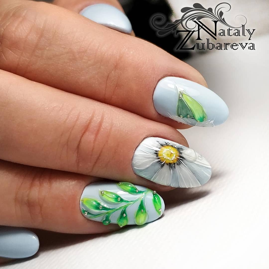 Среди новинок идей с цветочными и растительными принтами наиболее актуальными мастера называют реалистичные объёмные рисунки. Чтобы повторить стильный маникюр, возьмите: