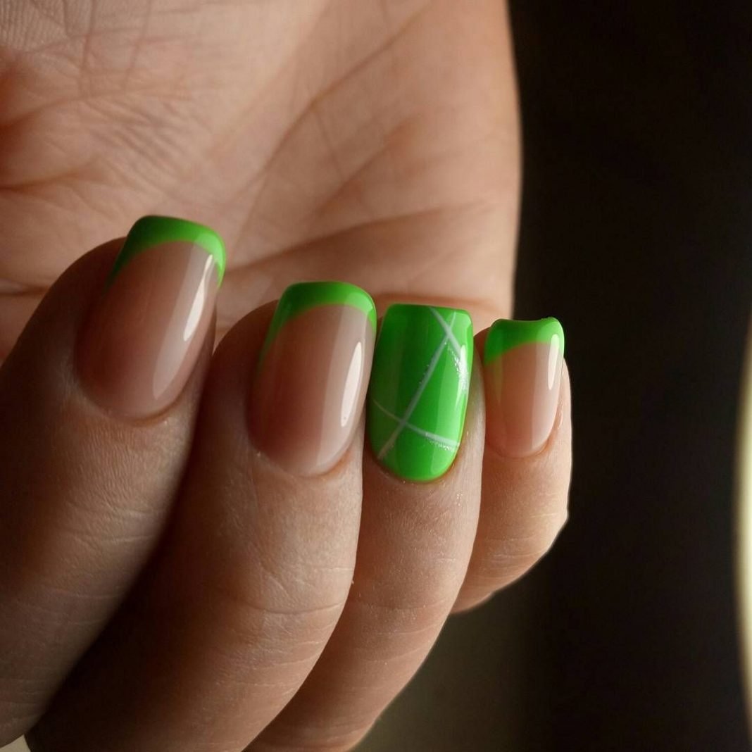 Французский зеленый маникюр смотрится на средних ногтях хорошо, если сделать цветной акцент по краю ногтя, это не повлияет на их визуальную длину, только придаст пикантности.