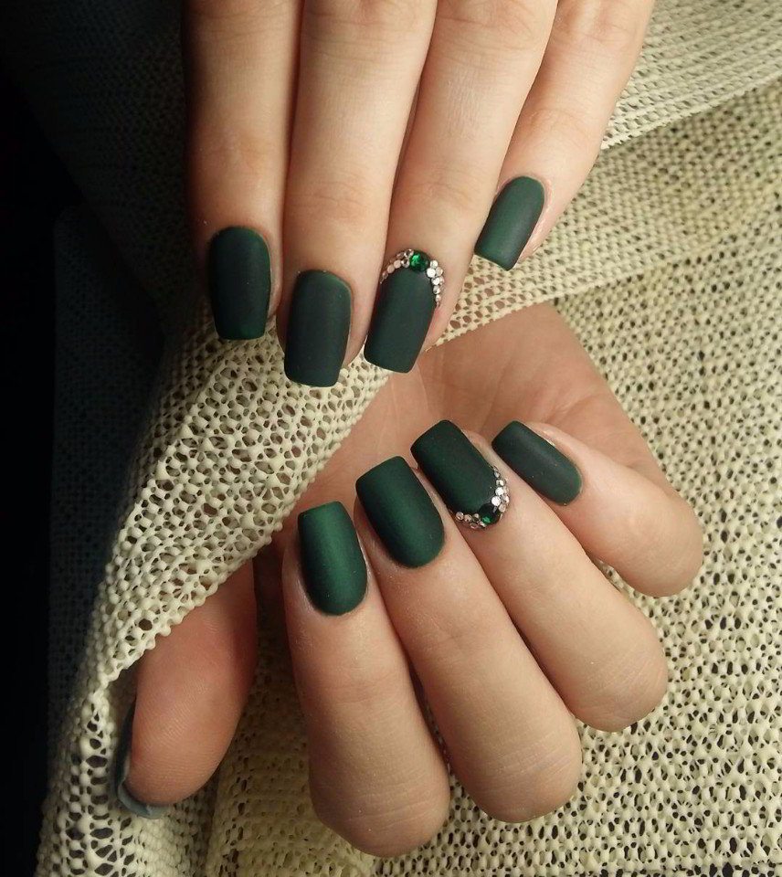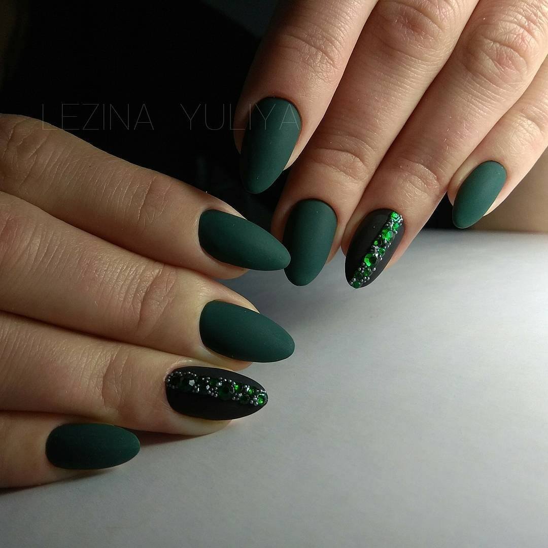 Если говорить о зеленом маникюре со стразами, то тут все сдержанно и лаконично. Зеленый цвет любого оттенка не нуждается в переизбытке блестящих камней. Минимализм в ногтевом дизайне постепенно и уверенно завоевывает женские сердца. Трендом сезона стало декорирование одним кристаллом всех ноготков. Также можно выделить один пальчик, украсив его небольшим узором из мелких камней. Сверкающие элементы выгодно дополнят зеленый маникюр с матовым покрытием.