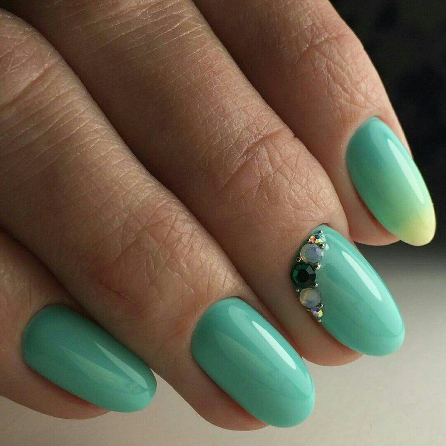 Стразы добавляют любому маникюру нежности и красоты, главное – не «перебарщивать» с ними. Для зеленого маникюра будет достаточно выделить лишь один ноготь, украсив его стразами. Этот декор на ноготках может быть разным: