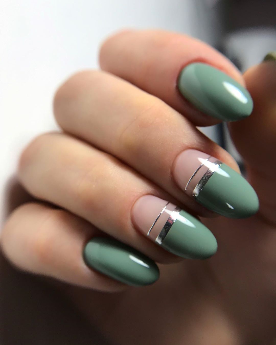 Еще недавно этот цвет казался необычным, но сегодня он является нейтральной классикой и особенно хорош во французском маникюре. Вариантов может быть несколько: от нюдового френча с оливковой кромкой до оливкового ногтя с черным френчем. Также подойдет диагональный френч с негативным фоном.