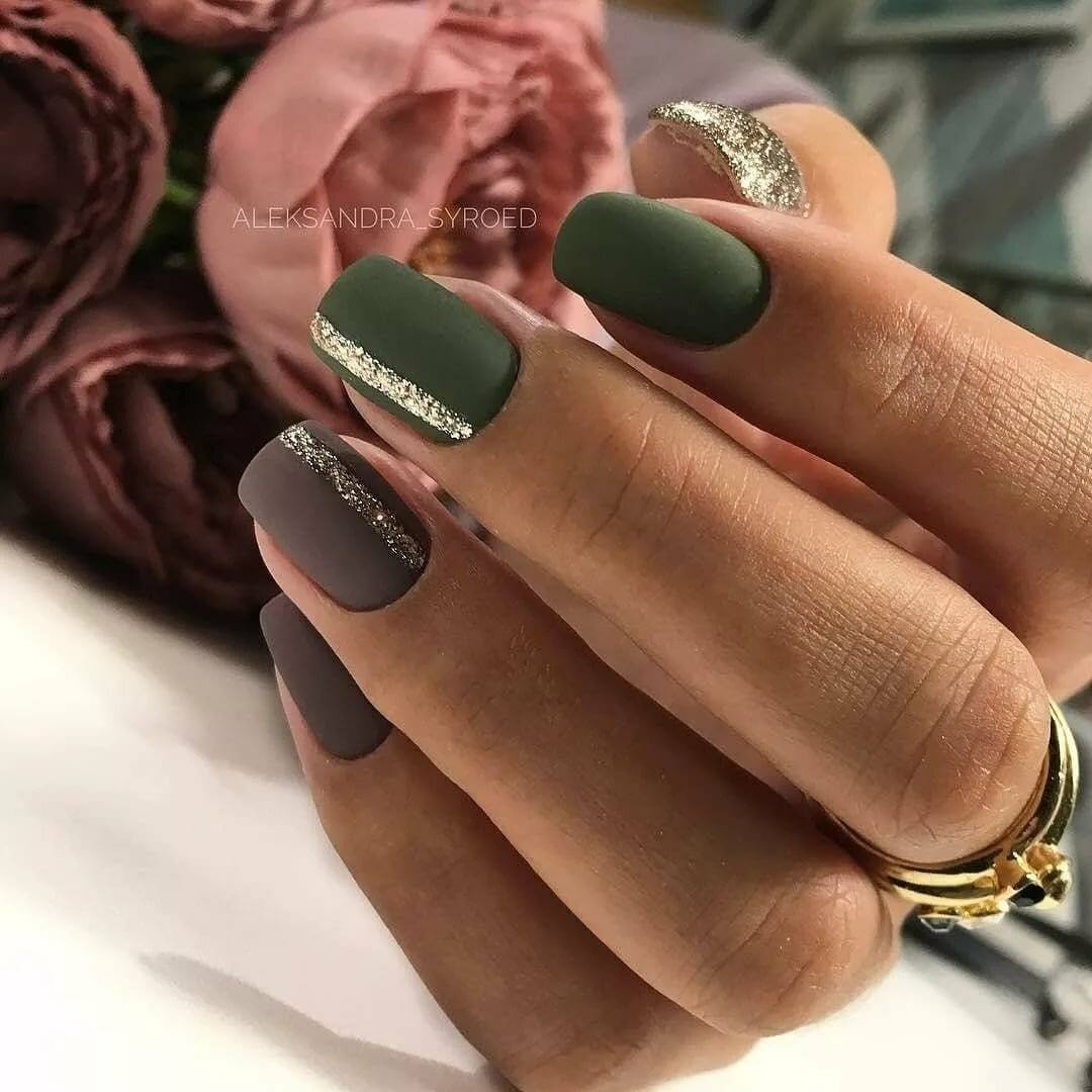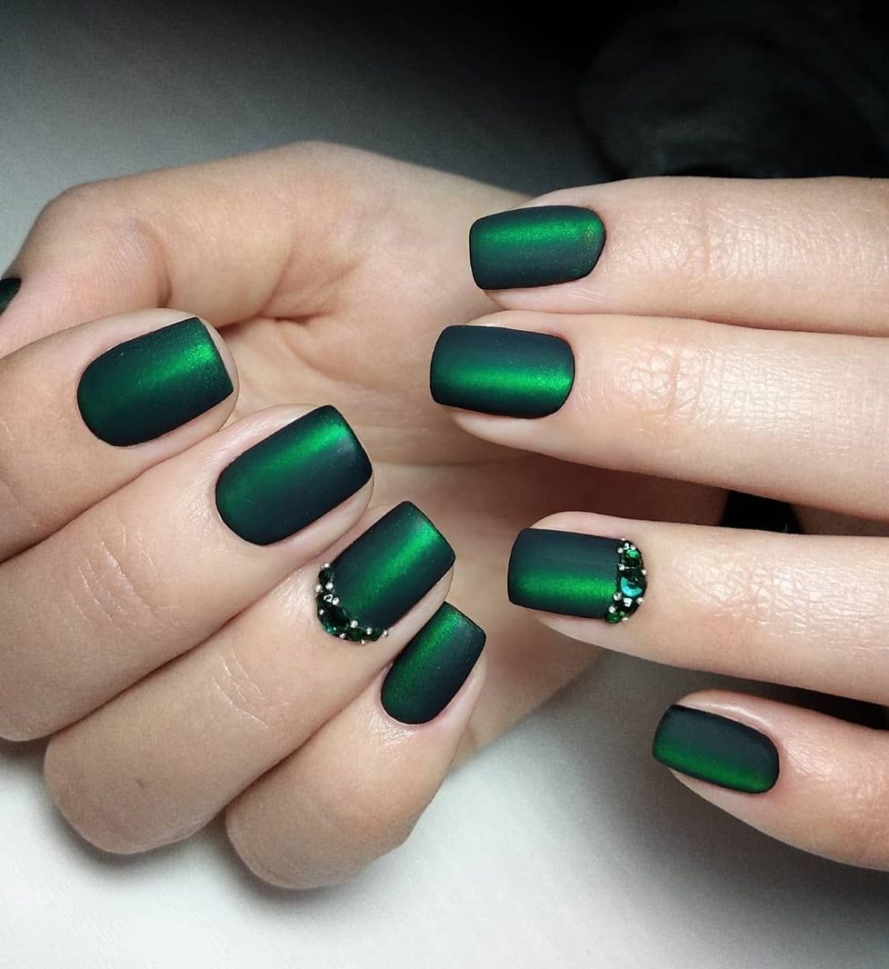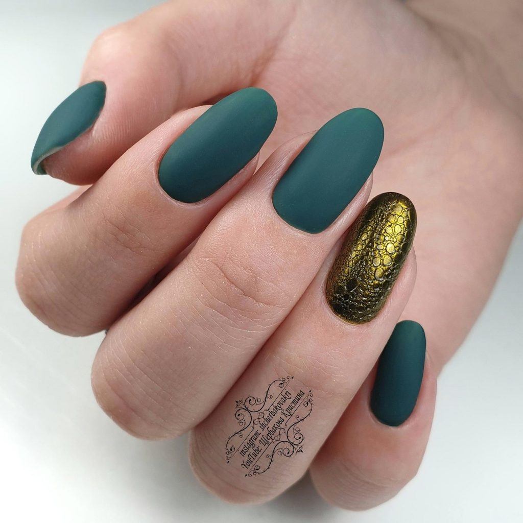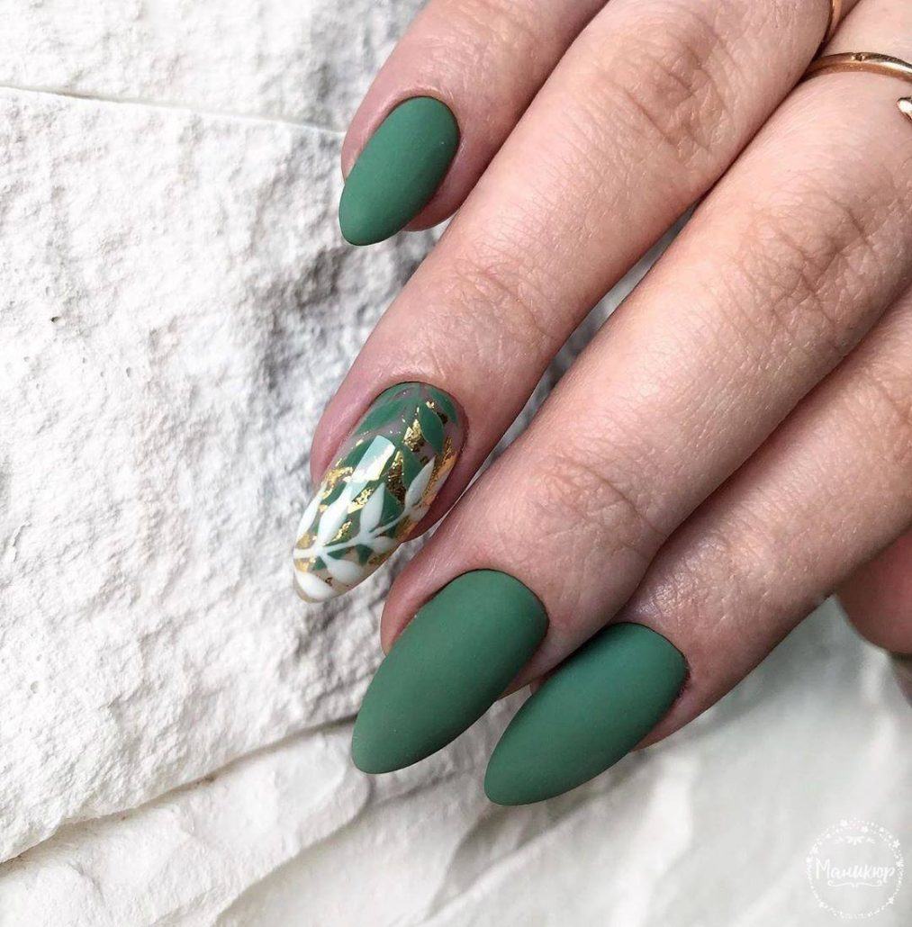 Настоящим хитом в декорировании зеленого маникюра считается матовое покрытие. Бархатистая текстура придает рукам теплоты, нежности и утонченности. Благодаря своей наполненности, маникюр выглядит гармонично и без дополнительного украшения. А если вы все-таки решили усовершенствовать свои ноготки, то дополните маникюр минимальным декором в виде мелкого рисунка или россыпи камней. Ваши ручки станут только женственнее и изящнее. Зеленое матовое покрытие ногтевой пластины комбинируют с белым или нюдовым. Торжественности и шика можно добавить с помощью золота.