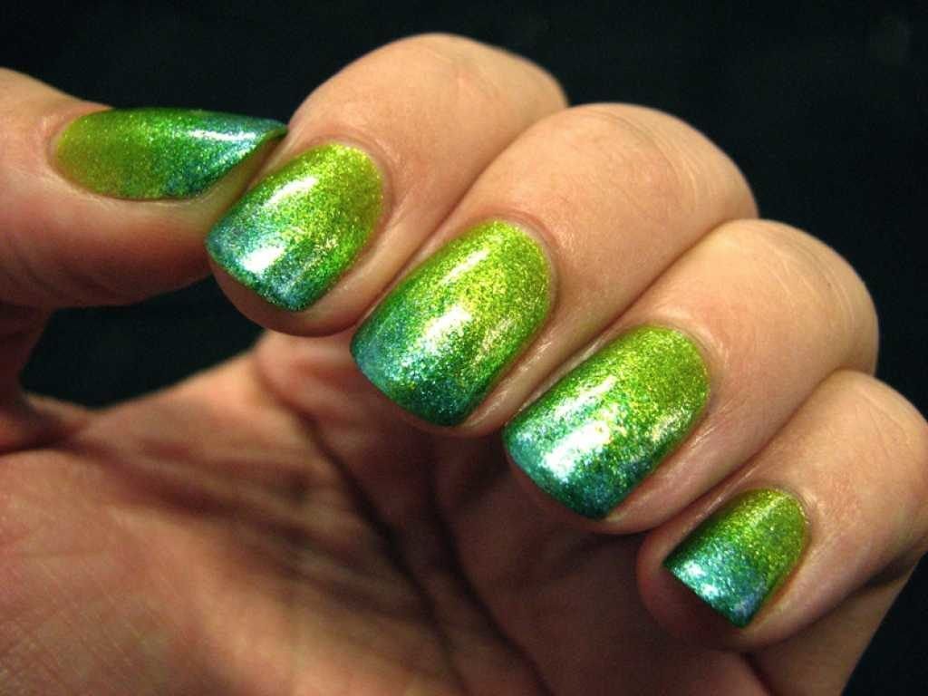 Маникюр зеленого цвета с техникой омбре – оригинальное и стильное решение для незаурядных личностей. Все цвета и оттенки зеленого идеально сочетаются в данной технике. Градиентный маникюр – это особая техника плавного перехода из одной цветовой гаммы в другую. Существует несколько разновидностей градиентного маникюра. Самый простой вариант – взять пять оттенков зеленого лака и поочередно покрыть каждый ноготок от самого темного к самому светлому.