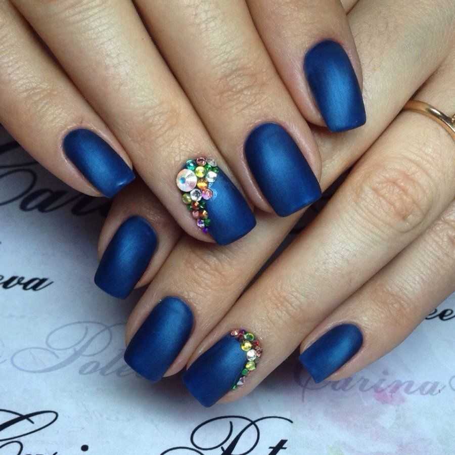 С такой круглой формой обычно делают однотонный маникюр, не сильно трудятся над дизайном (пару снежинок или один рисунок). Цвета классические: белый, синий, голубой, красный. Их комбинируют, как на одном пальце, так и на разных. Этот вариант маникюра не будет привлекать много внимания, поэтому подойдет для офисных работников.