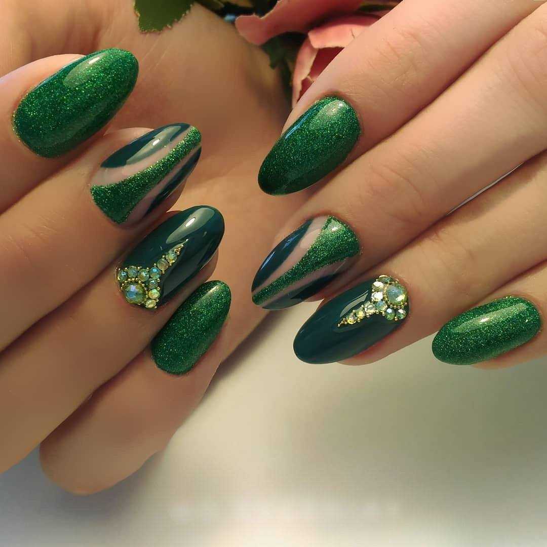 Обычно с острой формой миндаля, девушки выбирают дизайны с нежными оттенками и втиркой или стразами, так ногти смотрятся максимально празднично на Новый год.
