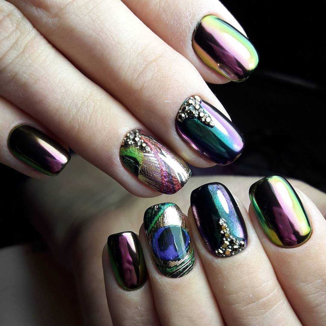 Это удивительный дизайн для маникюра с эффектом кошачьих глаз, который идеально смотрится на коротких ногтях. Для того чтобы создать мозаичный декор вам понадобится сразу несколько видов лака. Желательно, чтобы все цвета были контрастными.