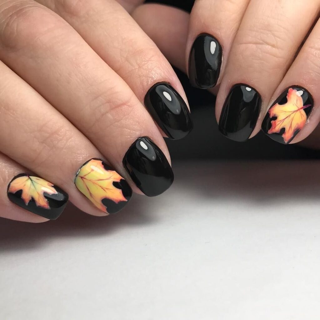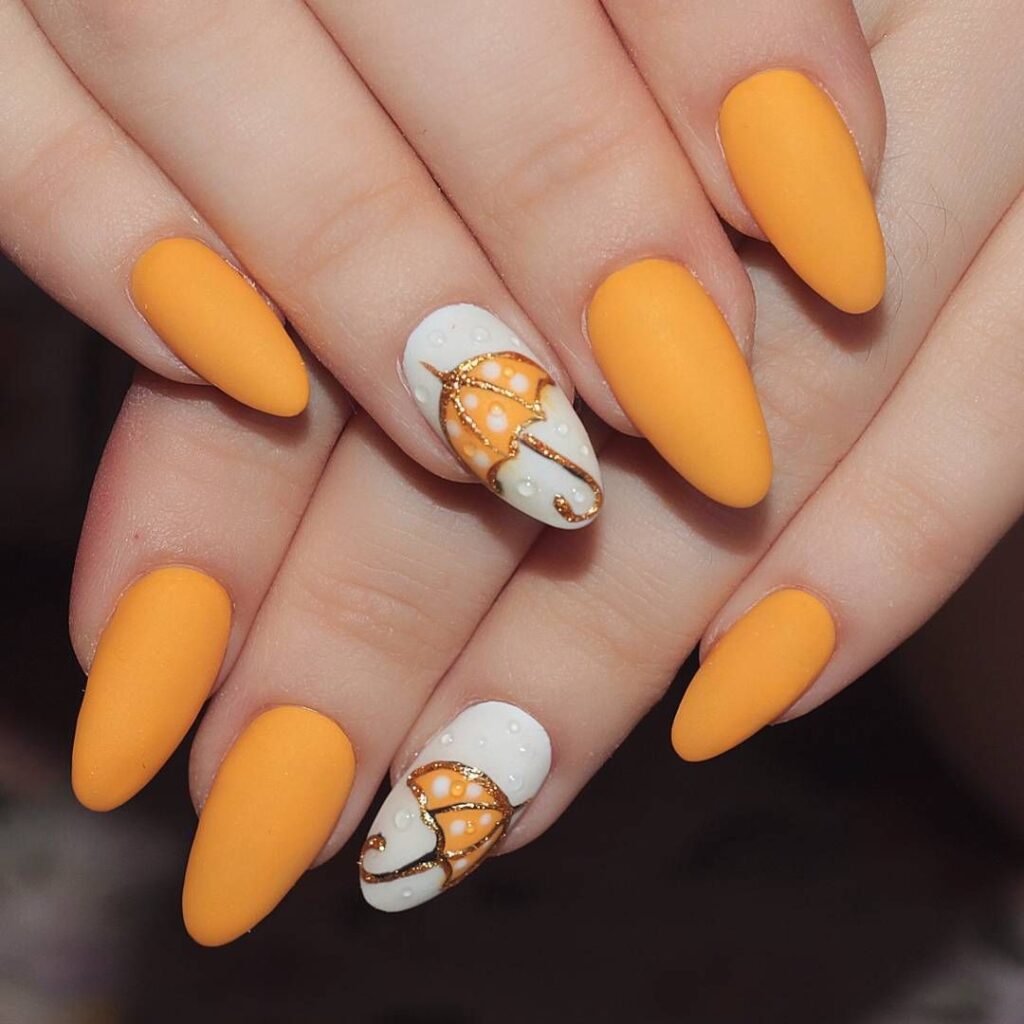 Хороший вариант для коротких овальных ногтей. Отлично будет выглядеть в тёмных оттенках. Здесь же можно обыграть приглушенный оранжевый, даже рыжий цвет, который не совсем подходит для такого дизайна в обычном применении.