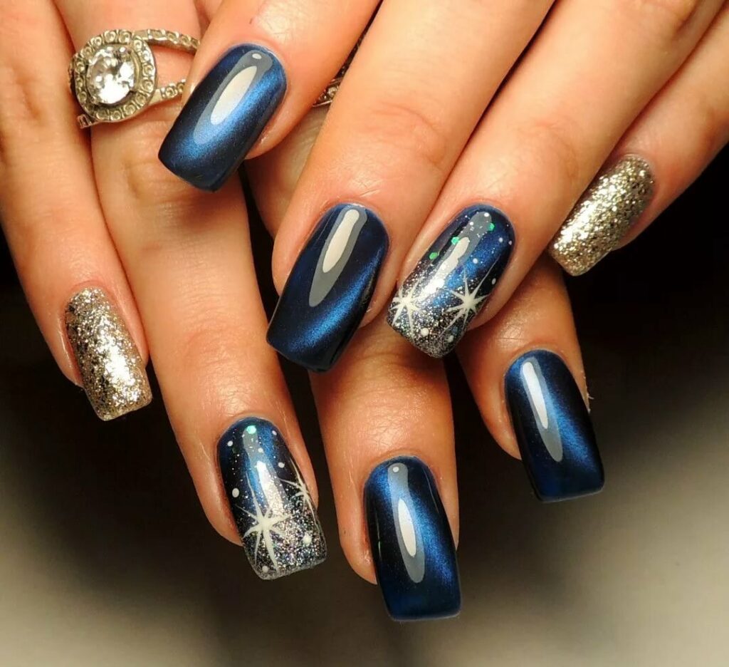 Блестящий овальный маникюр делать не рекомендуется. В лучшем случае — расставить акценты. Блестки остаются в трендах, но и тут ненужно перегибать. Хорошо дизайном подчеркнуть отдельные ногти, линии или даже рисунок.
