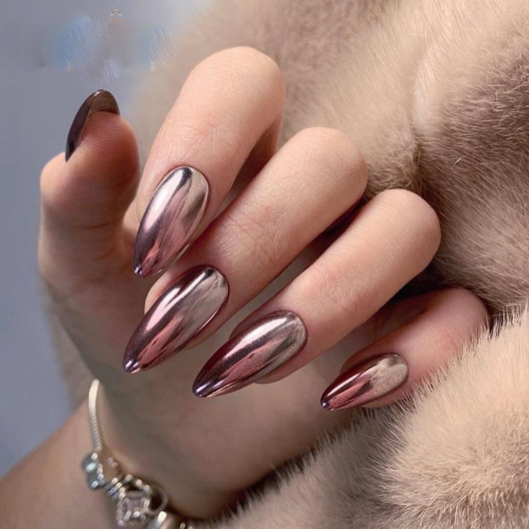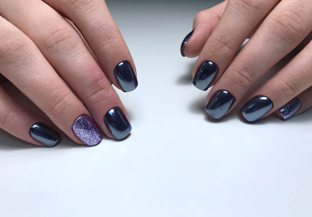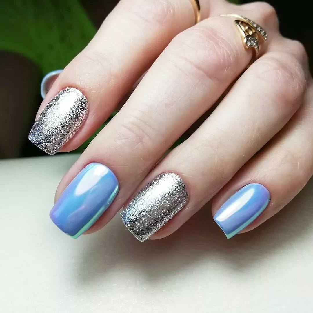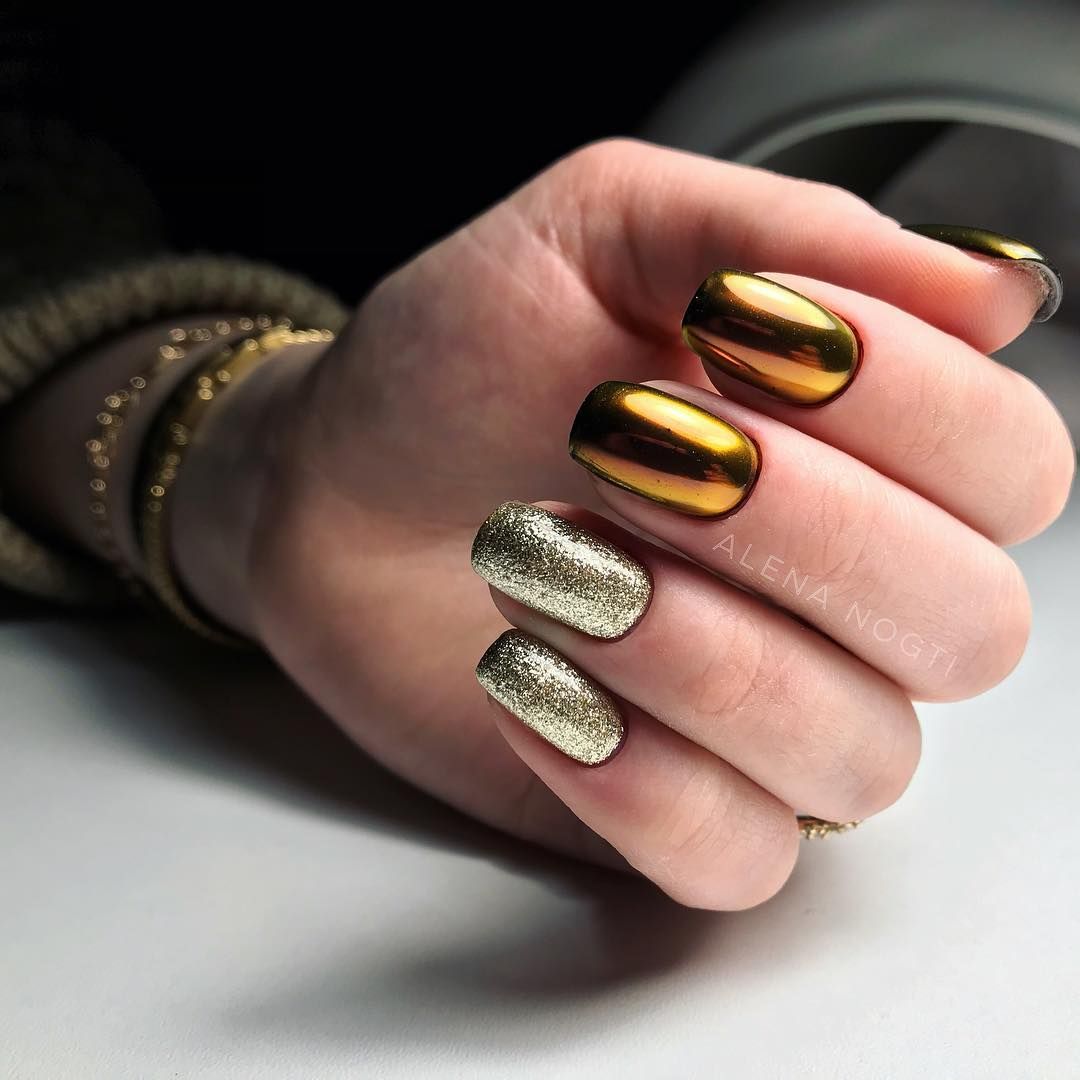 Золотистый либо серебристый зеркальный пигмент наиболее выигрышно смотрится в сочетании с темными оттенками покрытий. Однако при желании может выступать в тандеме и со светлыми тонами. В сезоне 2021 вы можете смело использовать зеркальную пудру как самостоятельное украшение для ногтей, а можете применять пигмент в качестве базовой основы для последующего нанесения узоров либо декора.
