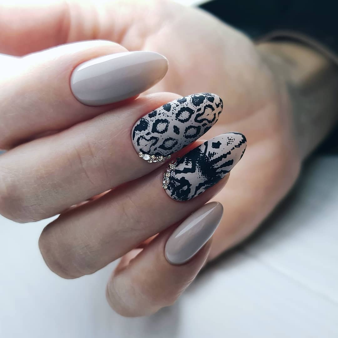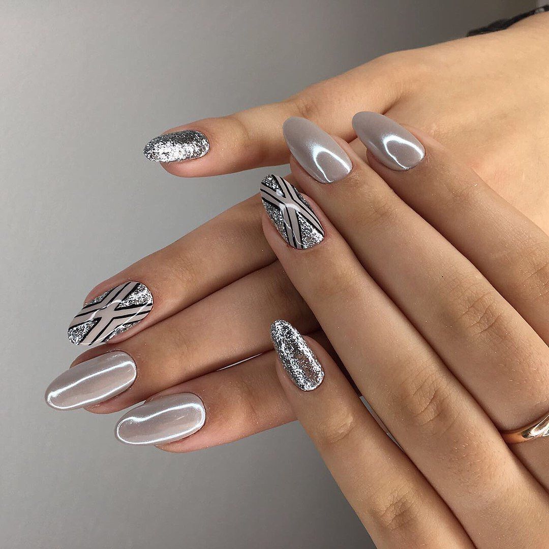 При этом весьма интересно выглядят и привлекают внимание не только дуэтные сочетания серого с белым или чёрным, но и оригинальные трио, в состав которых входят как базовые, так и любые другие оттенки, например, розовый. Это могут быть лаконичные и сдержанные идеи оформления, в которых узоры наносятся непосредственно на серое основание, а могут быть различные комбинированные идеи с цветными мраморными разводами, стразами, фольгой и прочими дополнениями