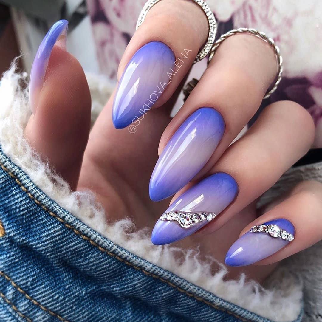 В дизайне Хамфри, показанном выше, на каждом ногте используются как теплые, так и холодные оттенки. Слои желтого и абрикосово-оранжевого лака придают теплоту указательному и среднему пальцам, а светлые холодные оттенки синего украшают большой, безымянный и мизинец. На ногтях овальной формы аура получается весьма причудливой.