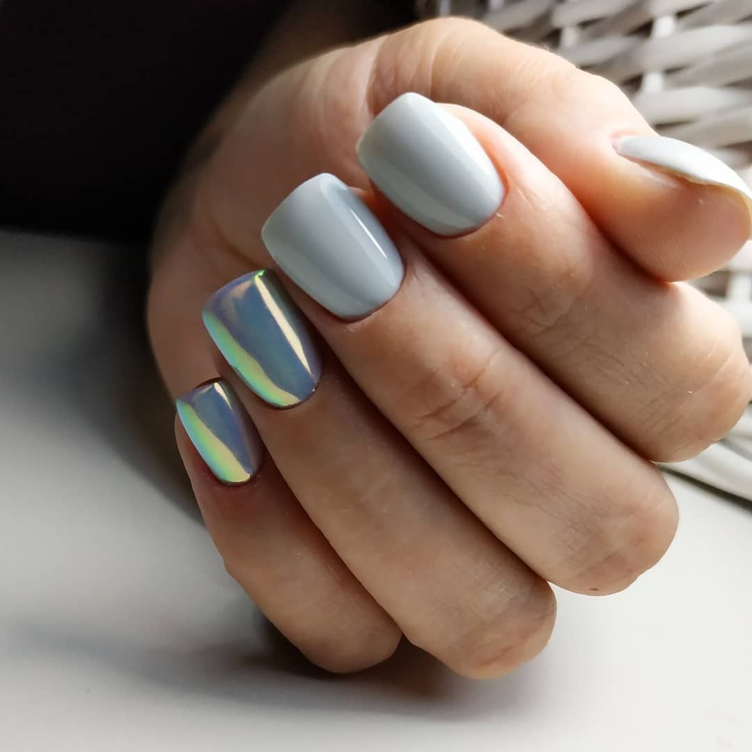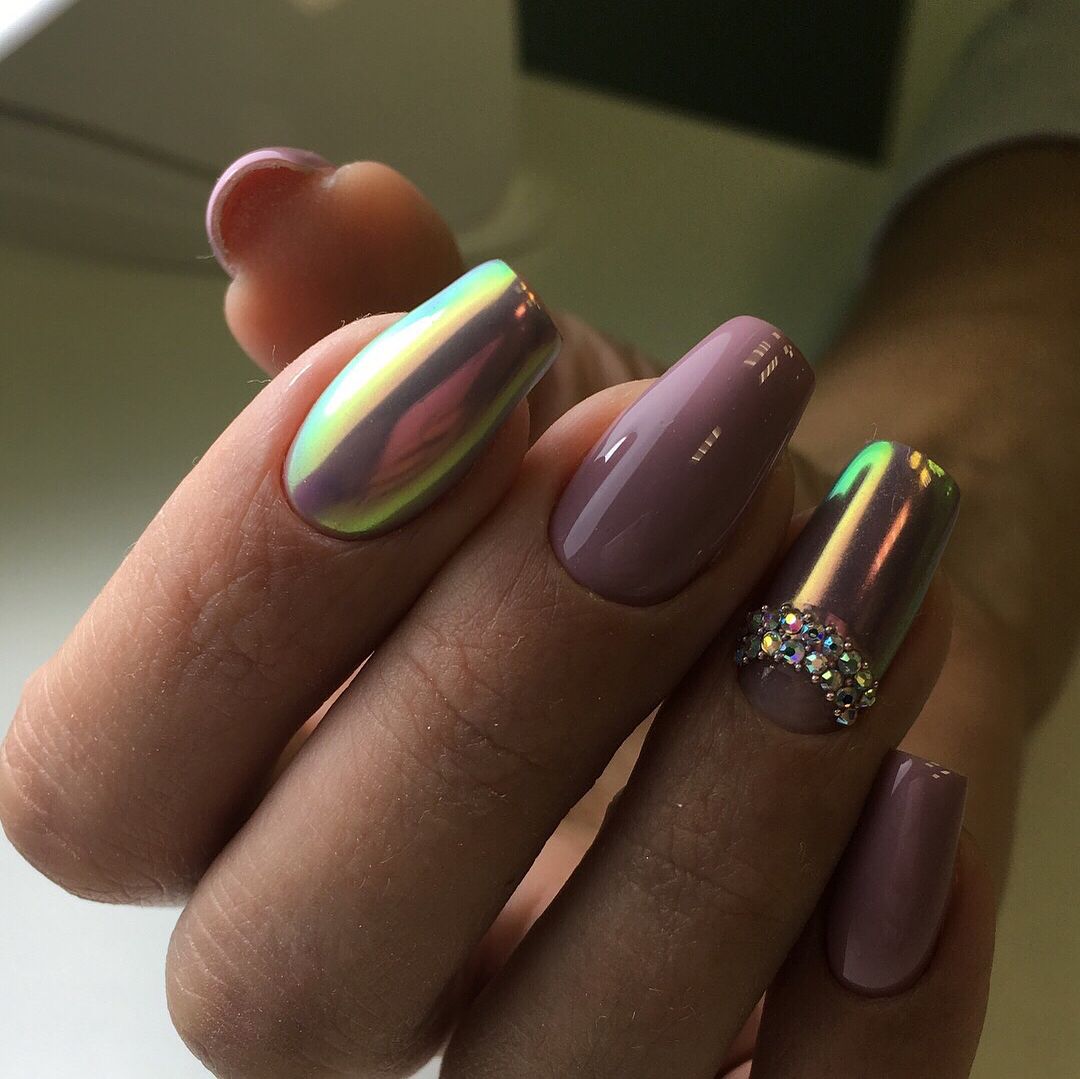 Подобные радужные переливы не оставят равнодушными ни одну модницу. К тому же голографическую пудру можно смело сочетать с любыми оттенками. Единственное, чего следует не допускать – это использование голографических переливов для одновременного дополнения всех ногтевых пластин. Оформление таким способом двух-трёх ноготков на одной руке будет вполне достаточно для создания «вау» эффекта.